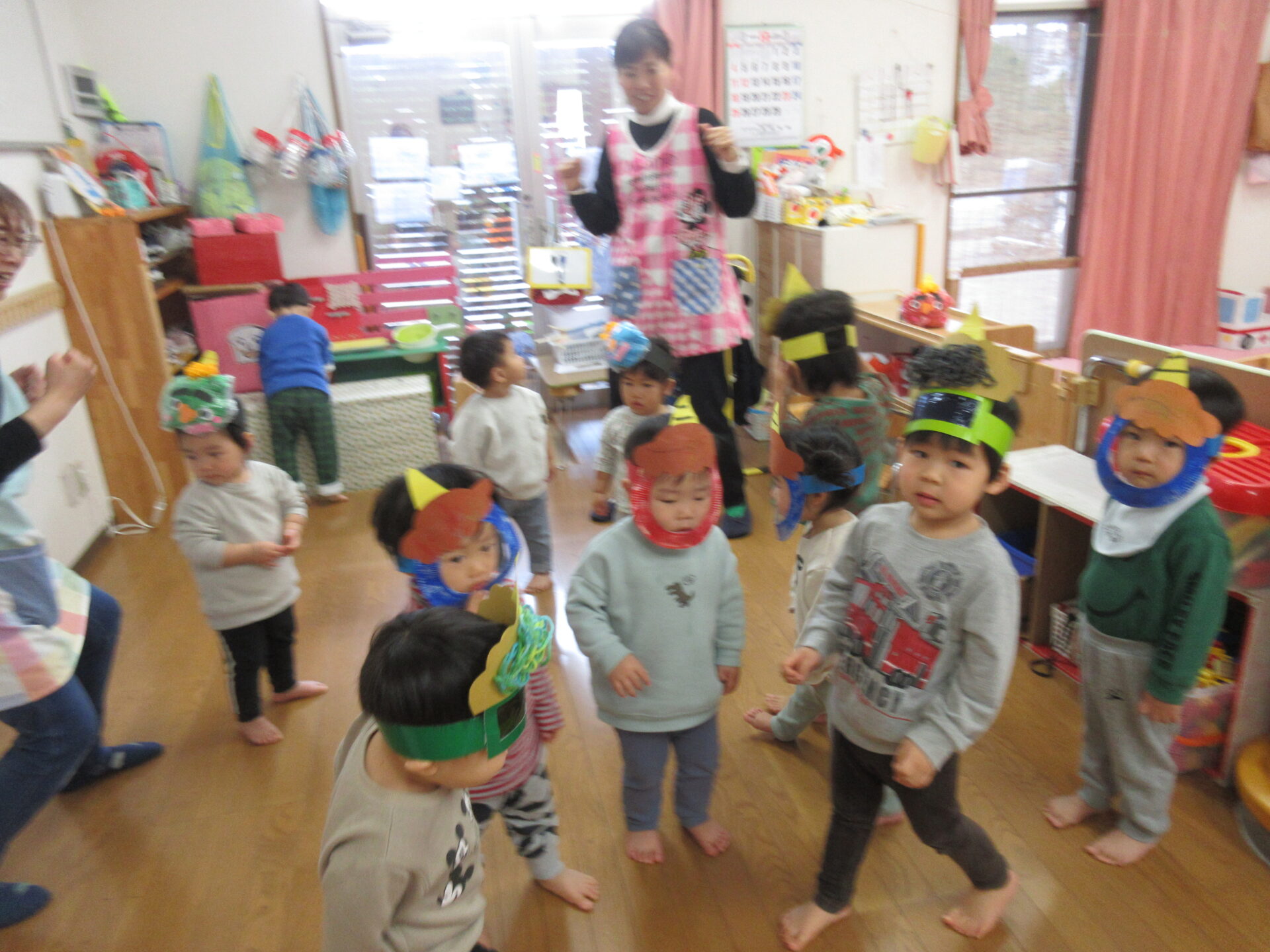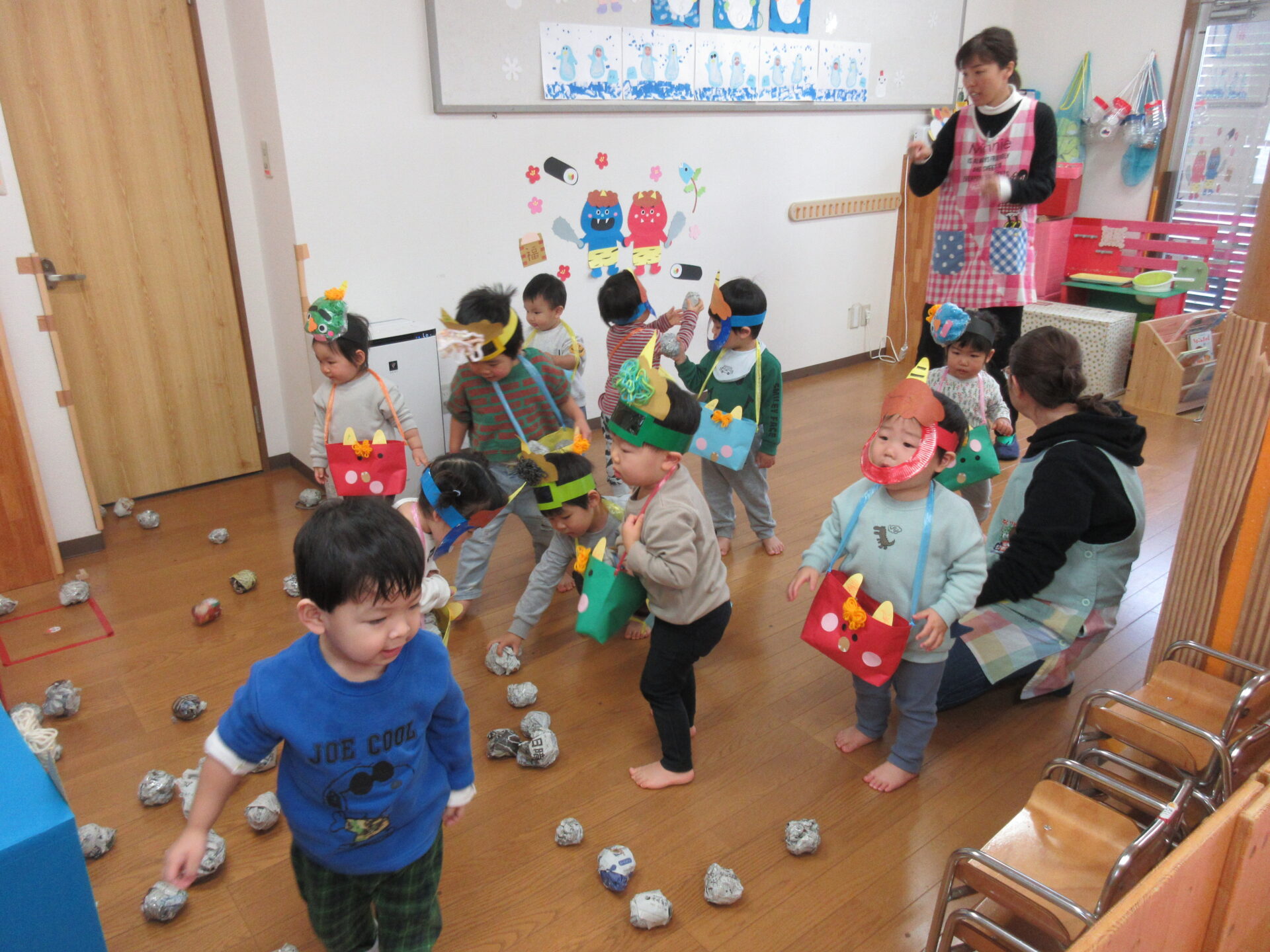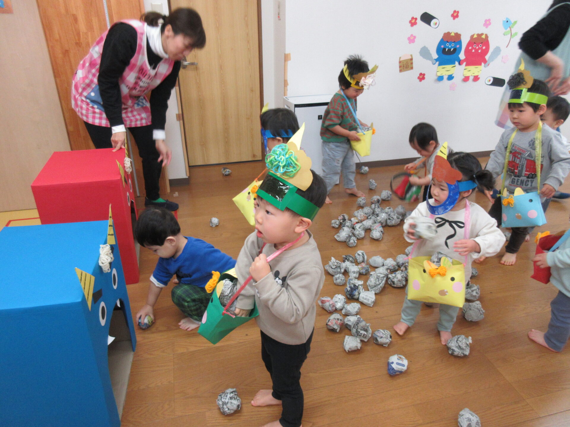 「豆まき」の歌を歌って、「鬼のパンツ」の曲で踊りを踊り、鬼のお面、豆入れを付けたらいざ豆まきです!!