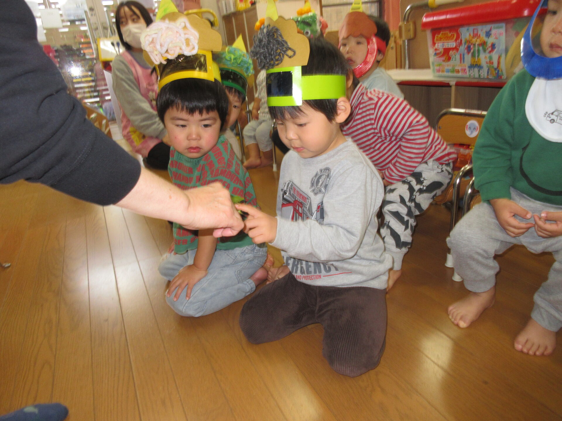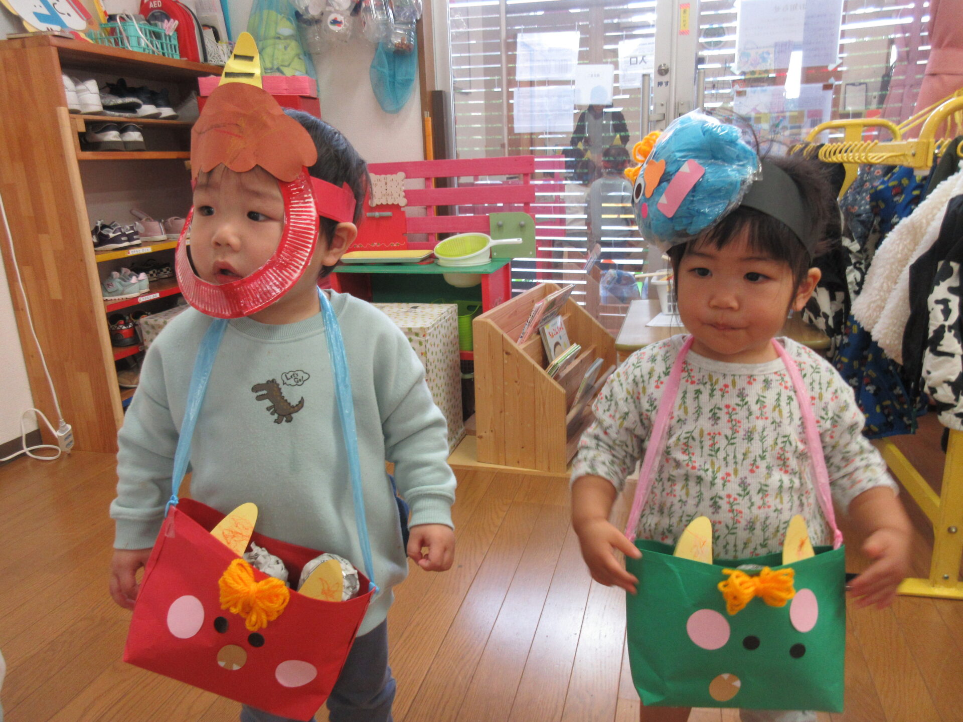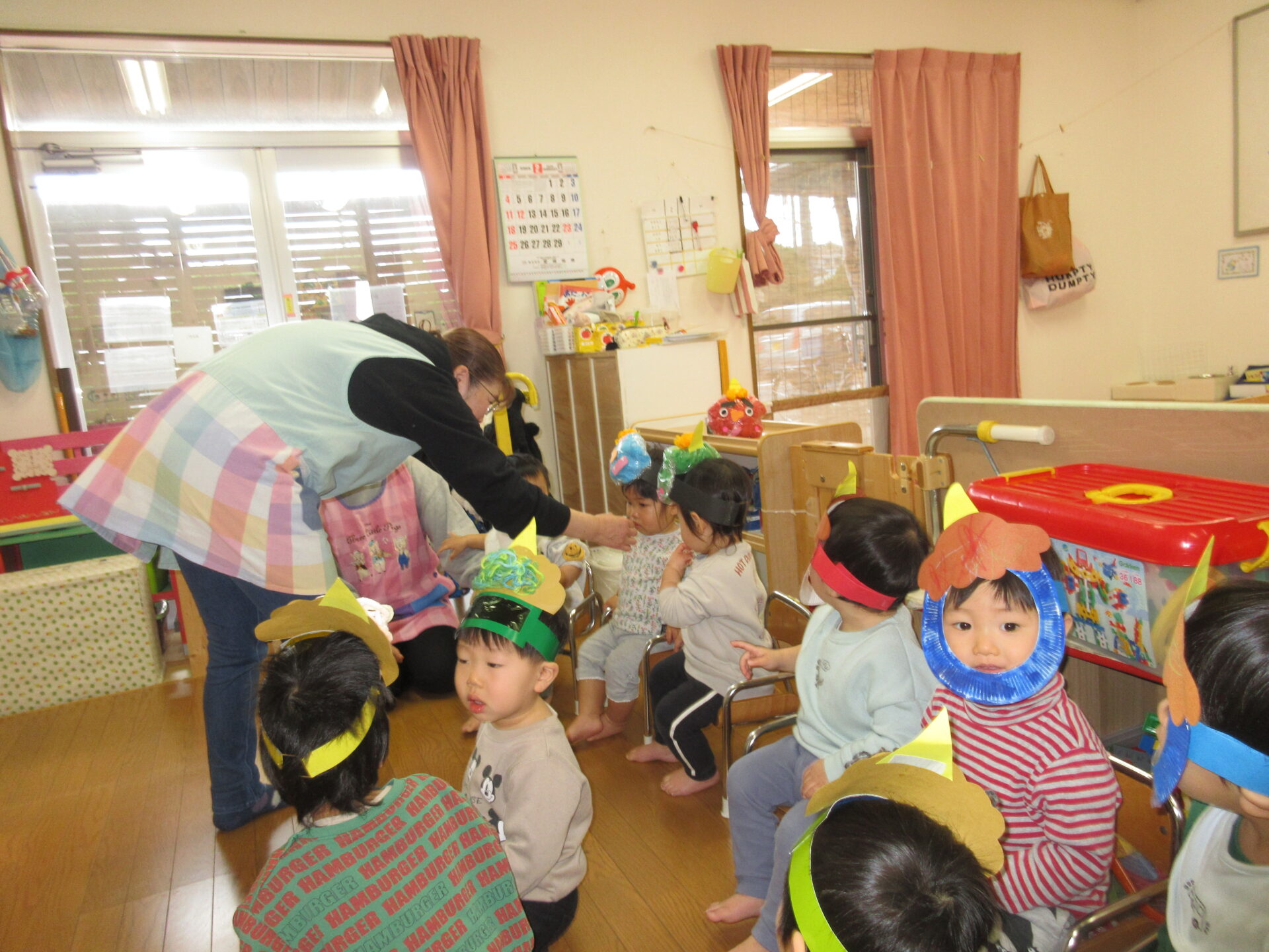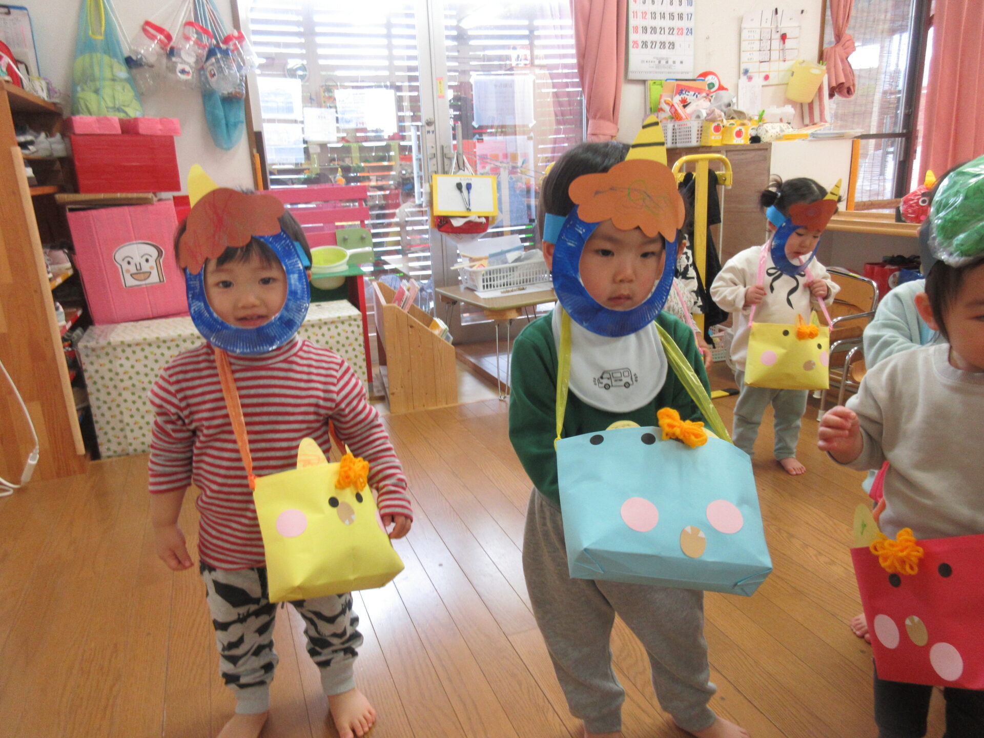 「豆まき」の歌を歌って、「鬼のパンツ」の曲で踊りを踊り、鬼のお面、豆入れを付けたらいざ豆まきです!!