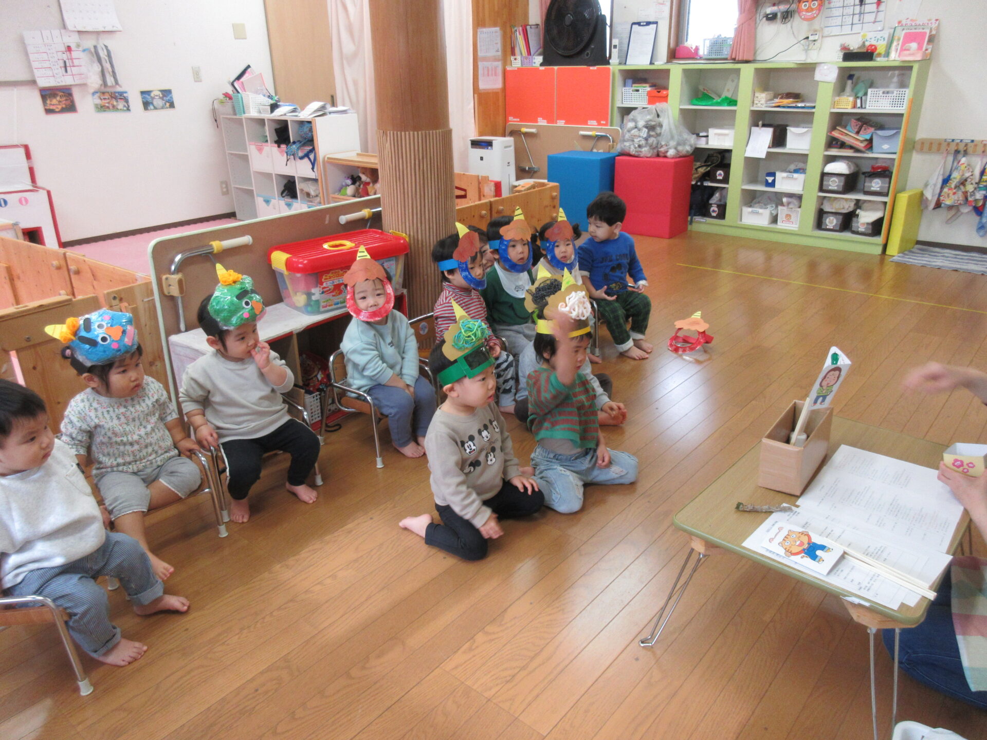 初めに、節分の由来を聞いたり、豆まきの話のペープサートを見たりしました。