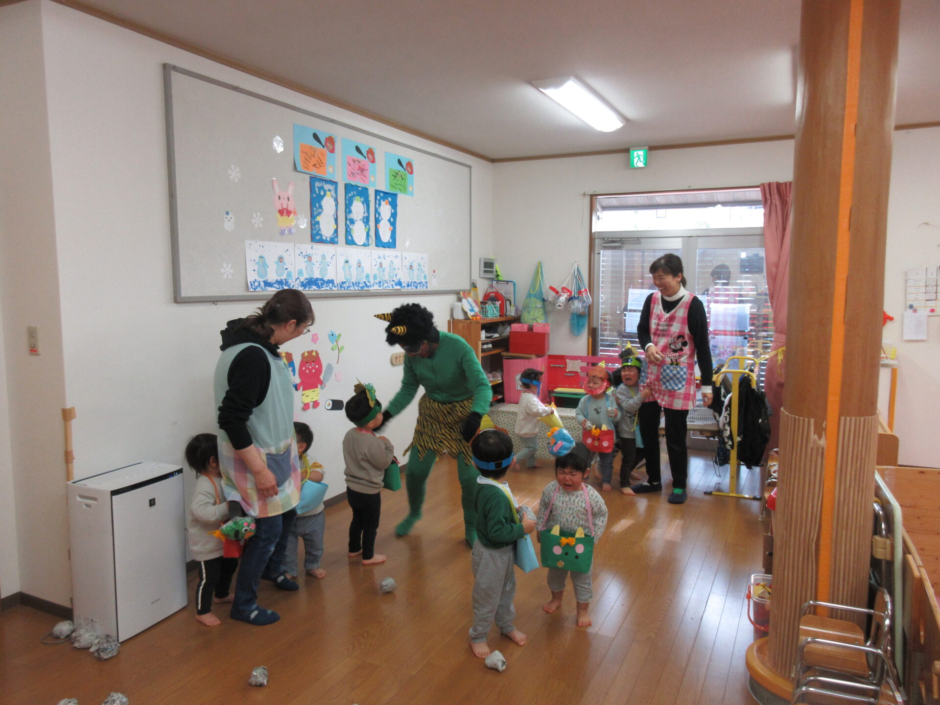保育者の足にしがみついて泣いたり、啞然として立ち尽くしたり、いろいろでしたが、誰も豆を投げるどころではありませんでした(笑)