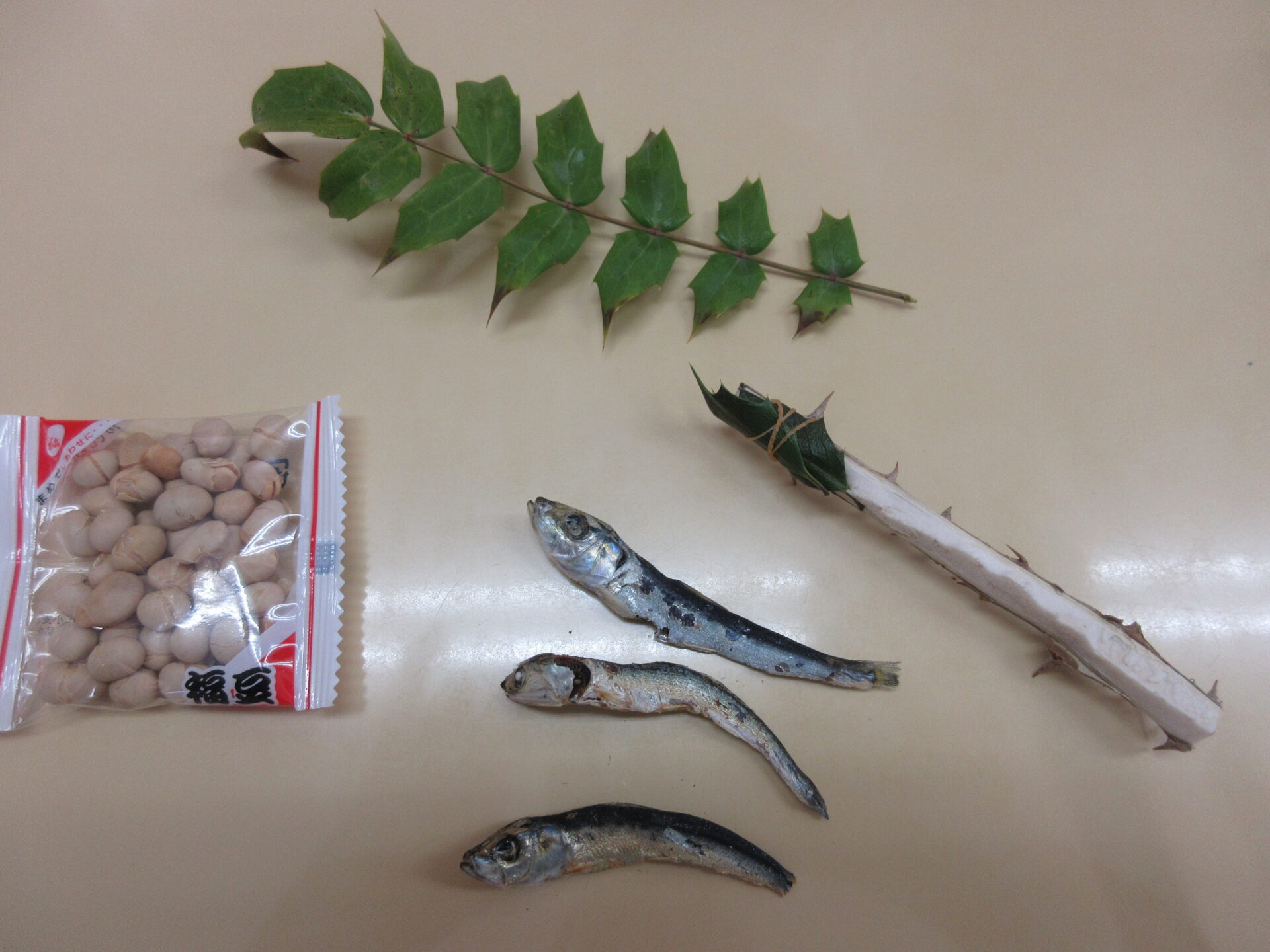 鬼が嫌いな豆や、柊の葉っぱ、鰯、鬼ぐいなど、実際に触ったり、においをかいだりしてみました。