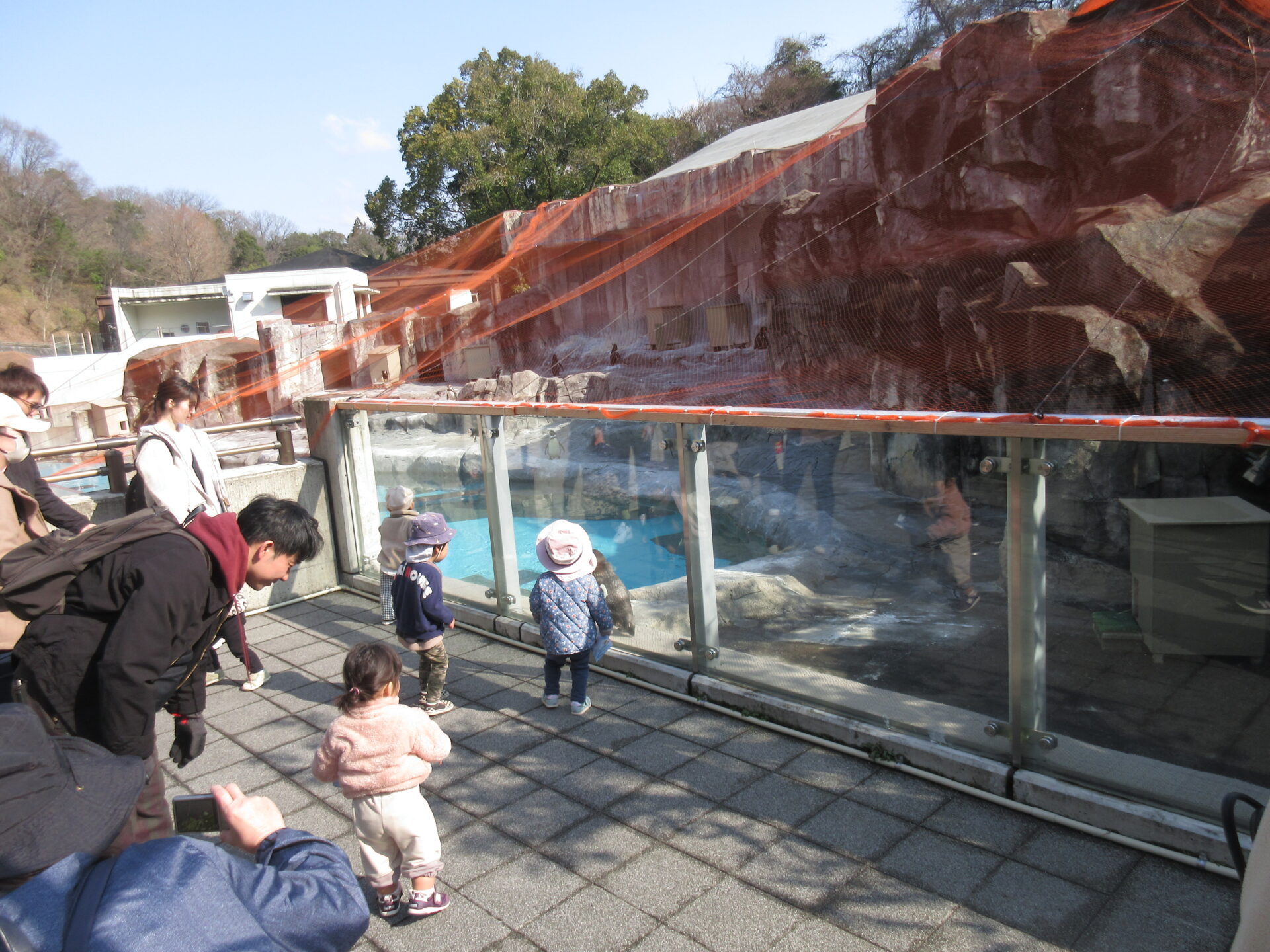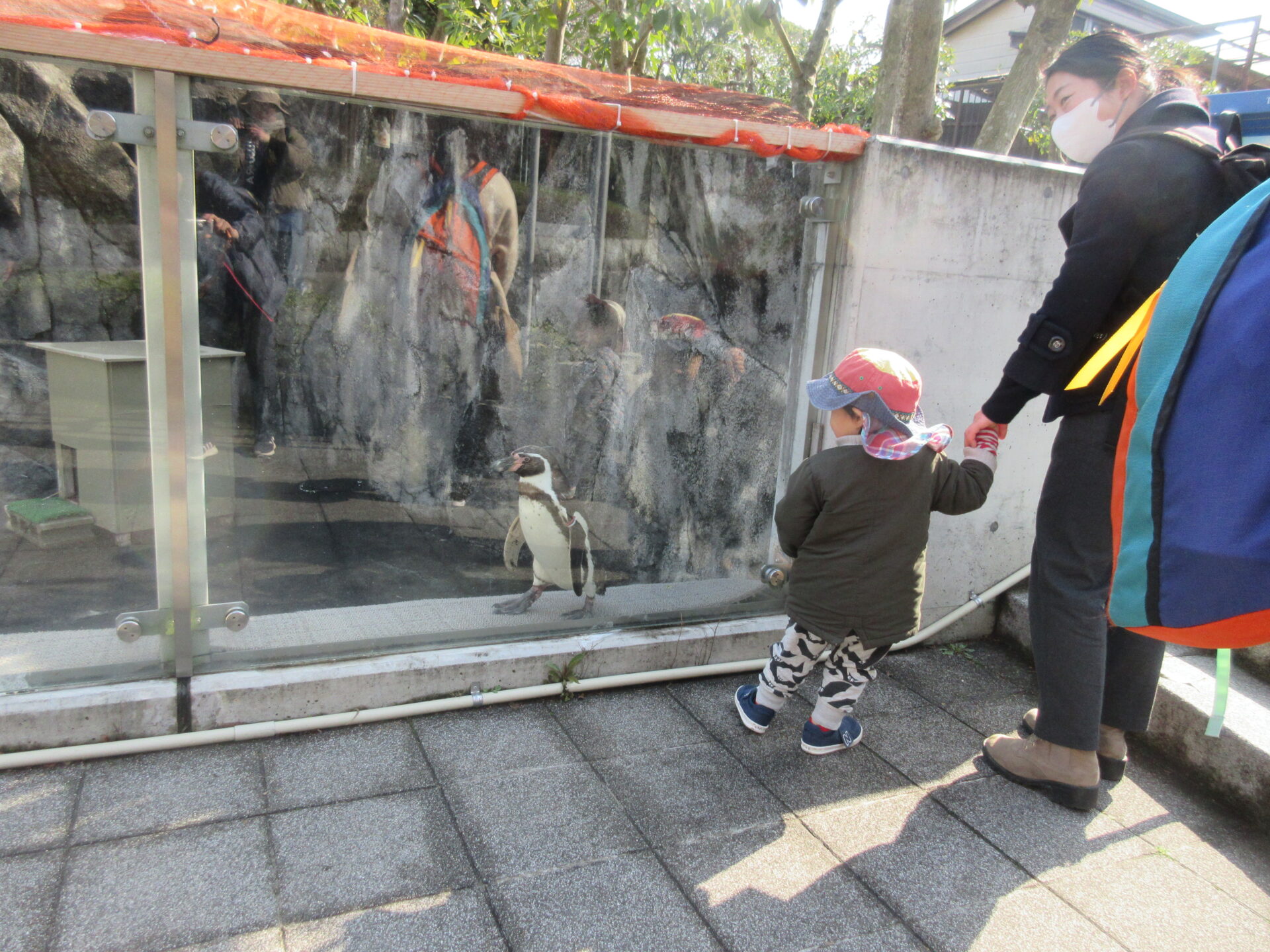 園内に入るとペンギンのところでは、まだ誰も泳いでなくて、泳ぐ姿のペンギンは見ることはできませんでしたが、1匹だけ、よく見えるところを歩くペンギンに出会うことができ、近くで観察することができました。
