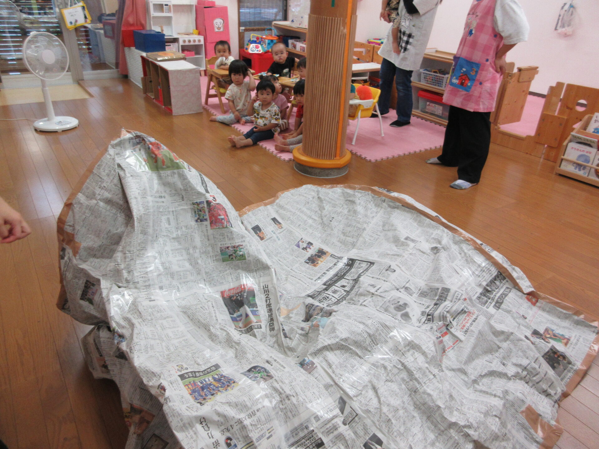 大きな新聞紙と初めての取り組みに試行錯誤して出来上がったのは、、、