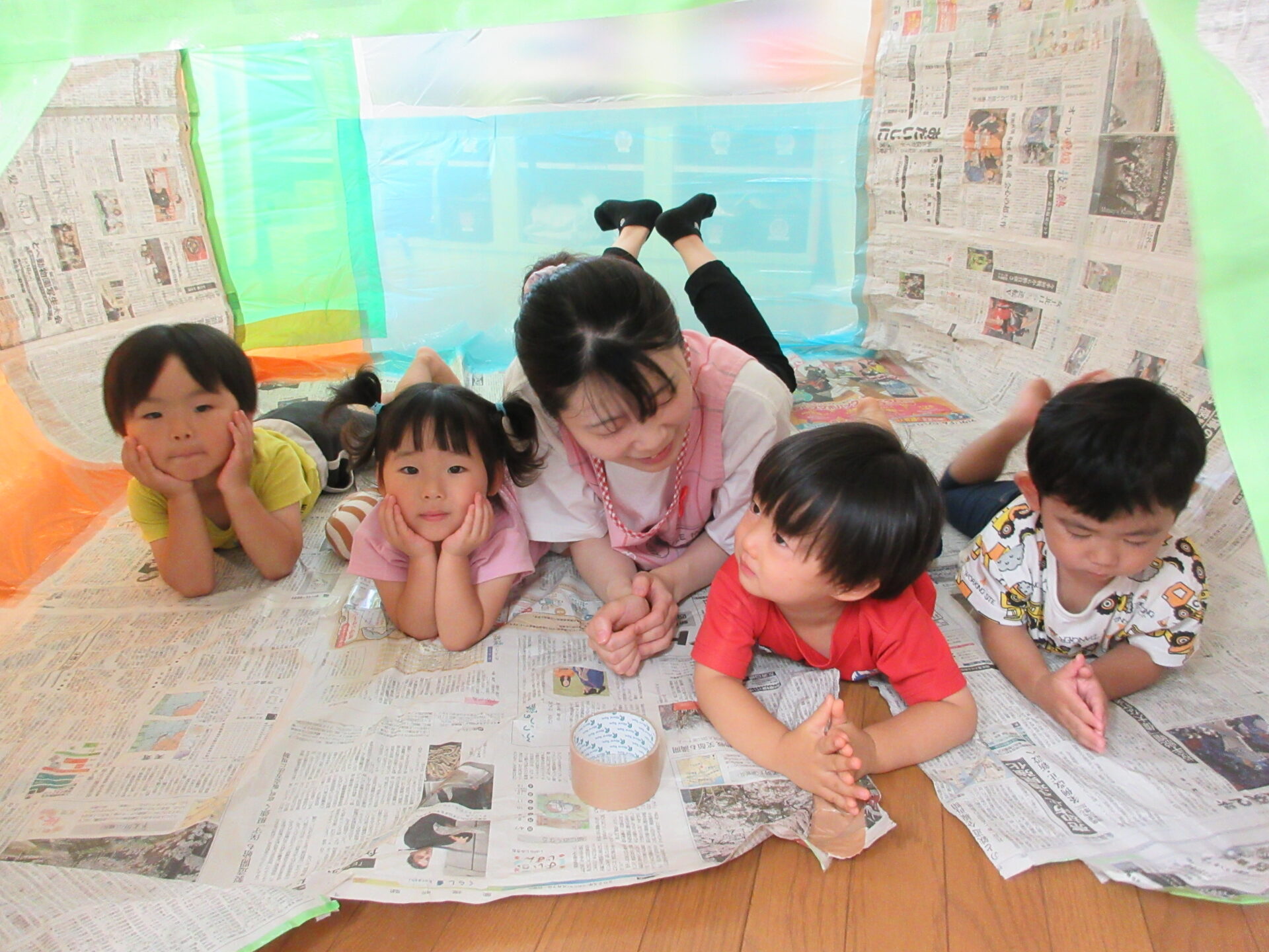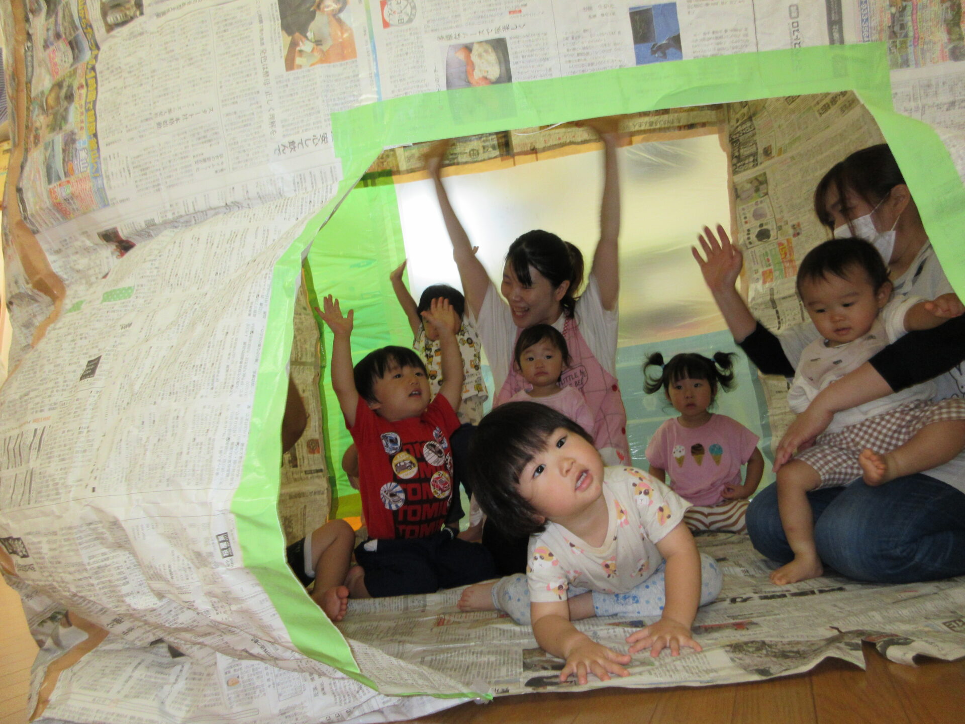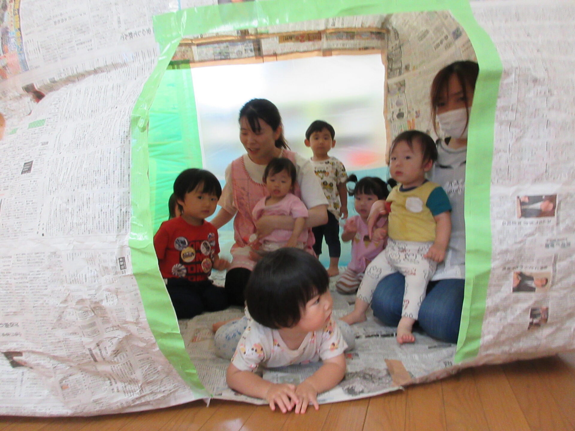 手を伸ばしてみたり、寝転んでみたりと思い思いに新聞紙の大きなお家を堪能しました🎵