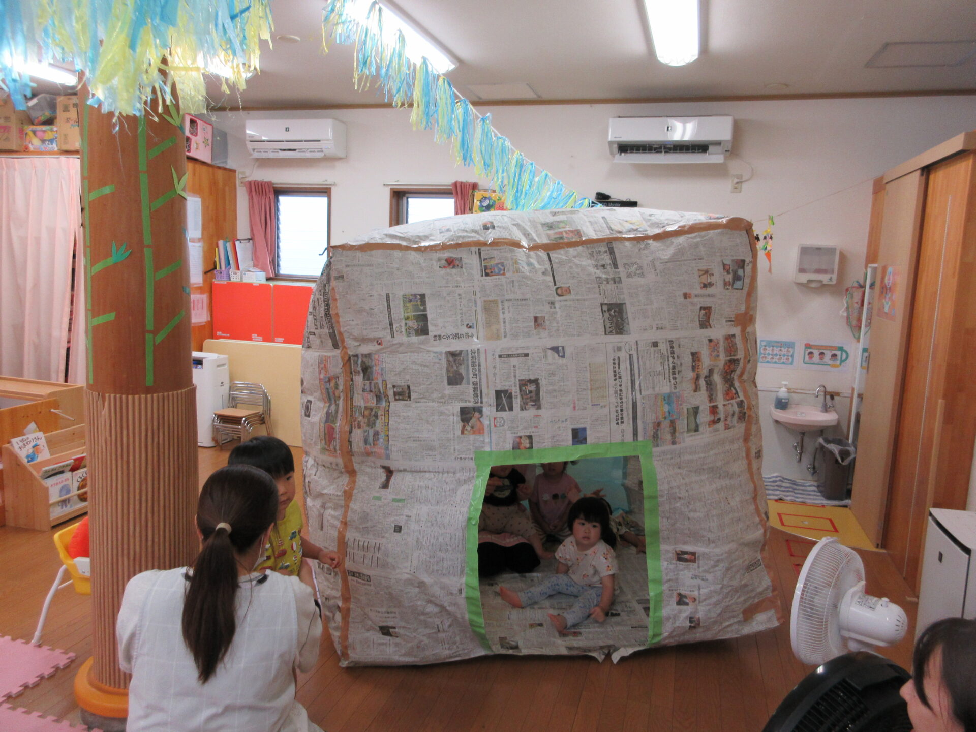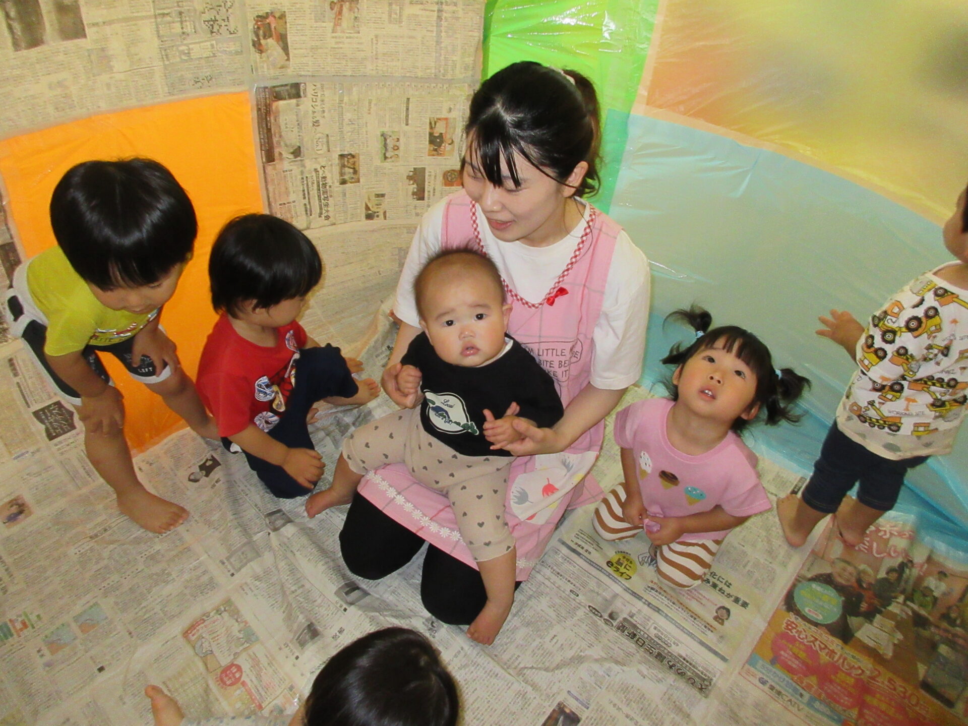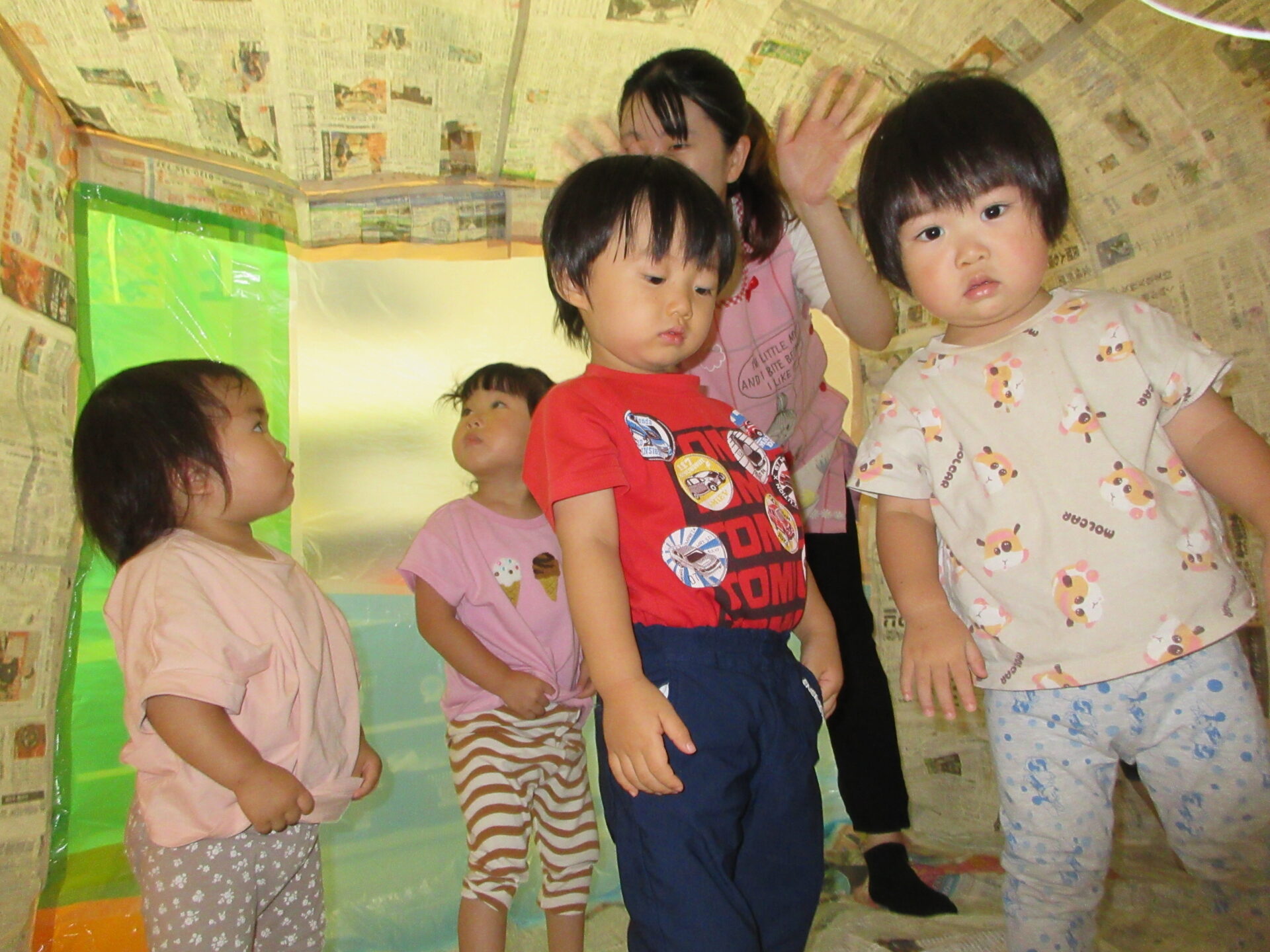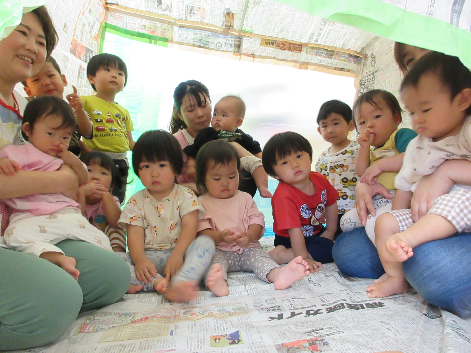手を伸ばしてみたり、寝転んでみたりと思い思いに新聞紙の大きなお家を堪能しました🎵