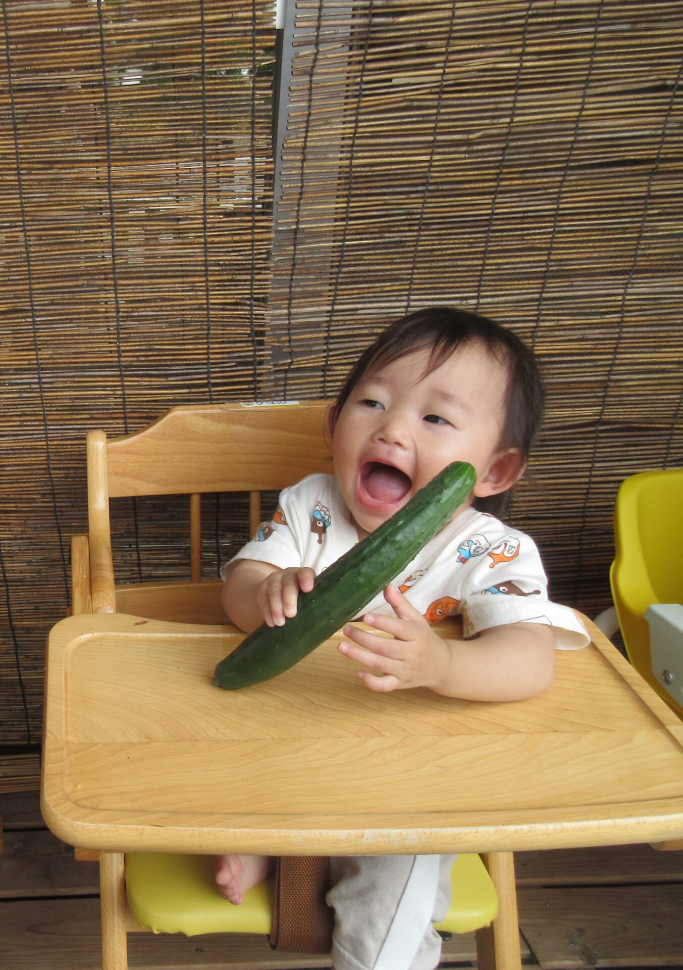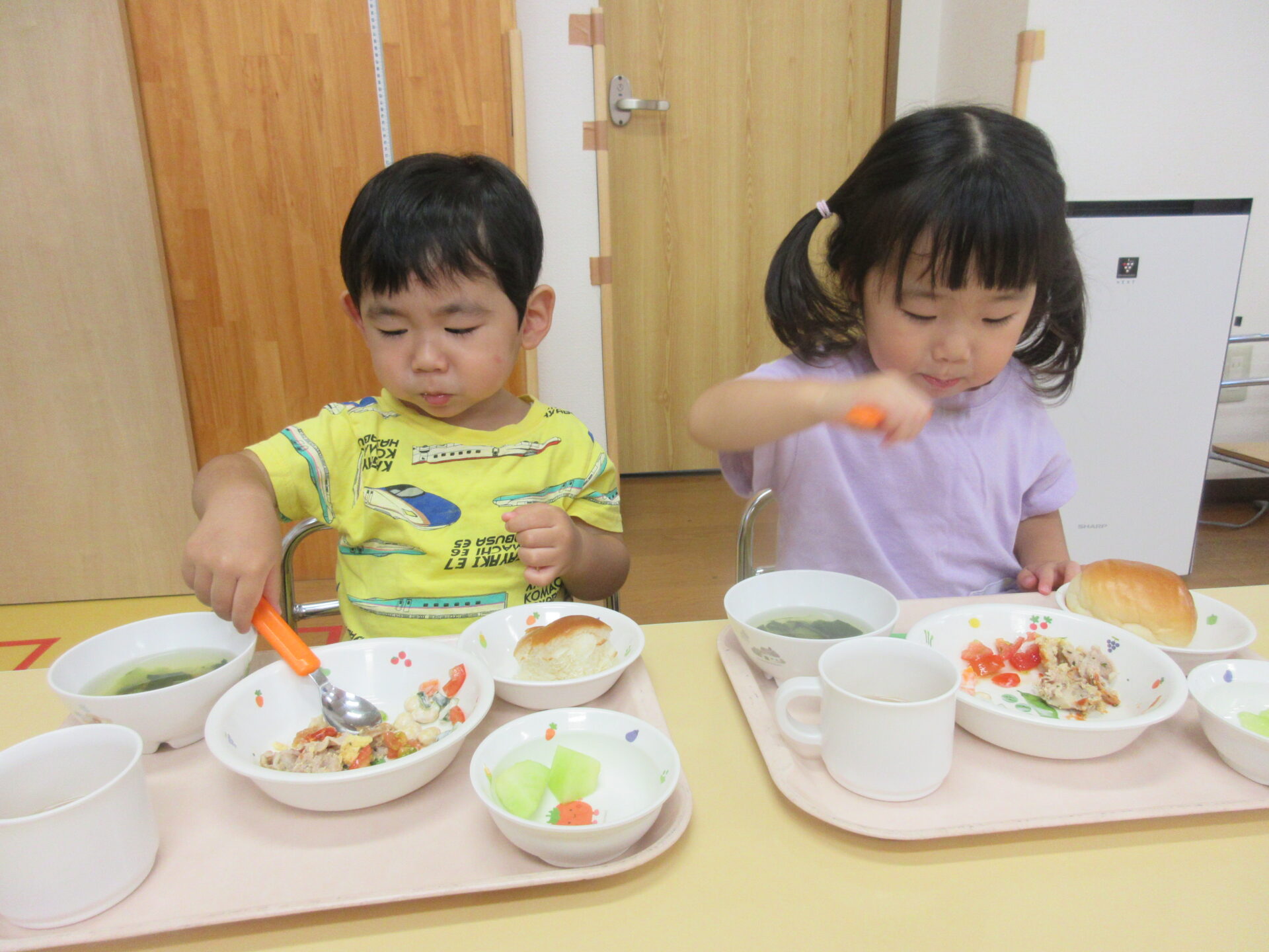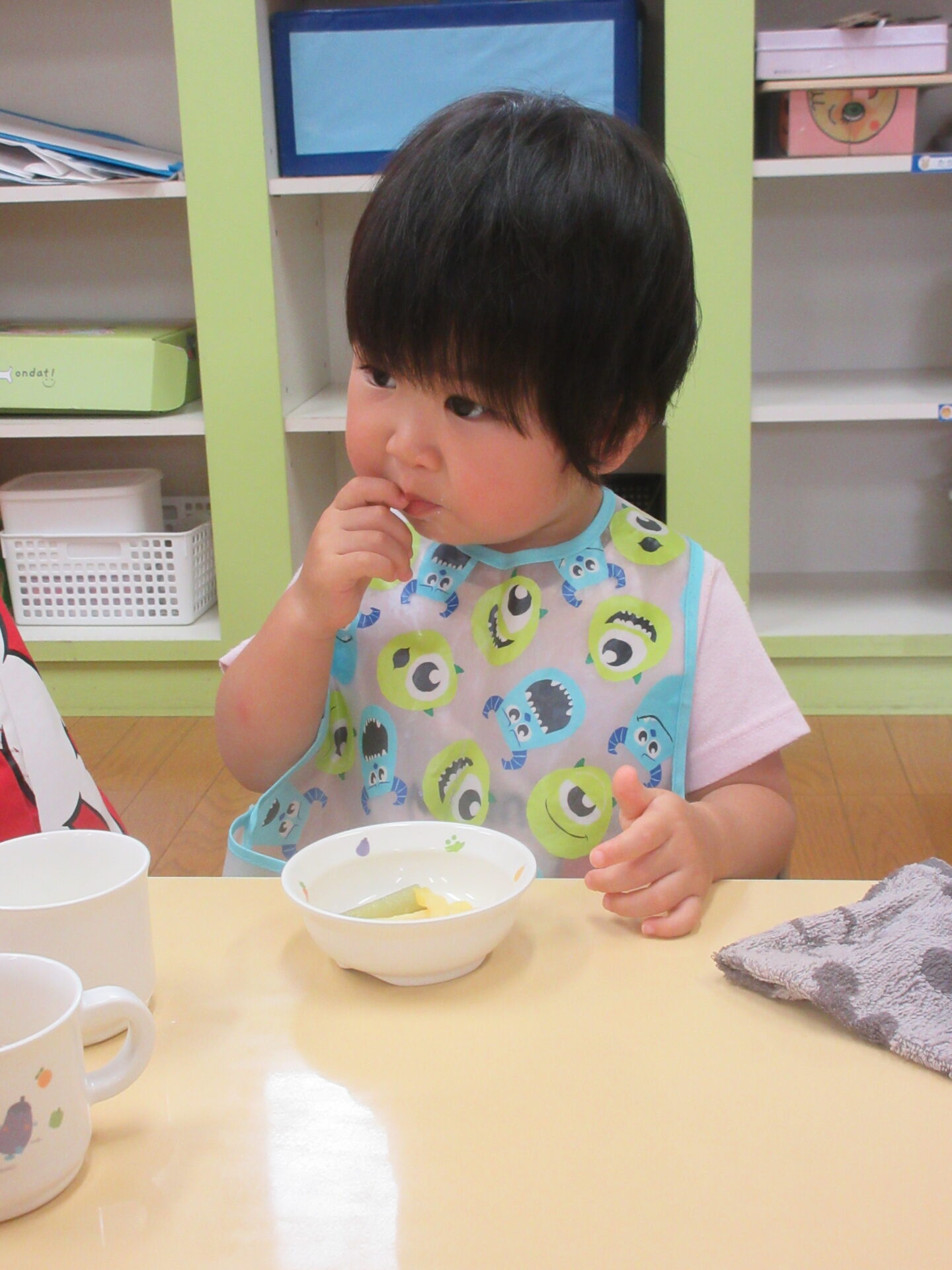 自分たちで植えて育てたお野菜は特別なようで、「みんなが育てたお野菜だよ」と伝えると、大きな口で運んでニコニコと嬉しそうでした。