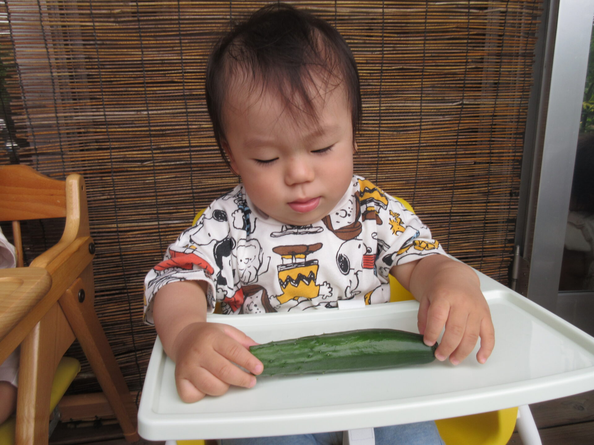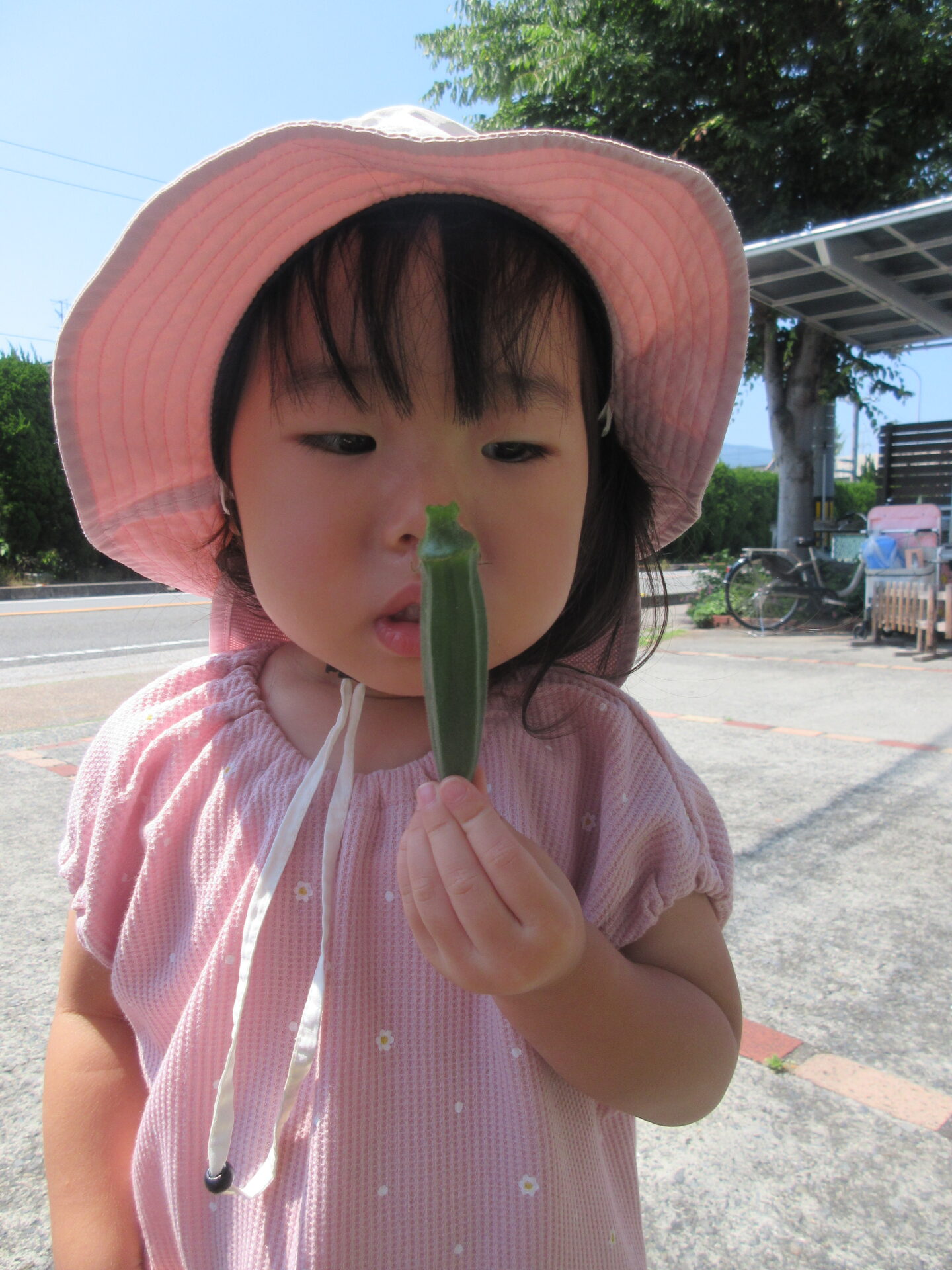 きゅうりは新鮮でとげとげがあることに気づき恐る恐る下の方を持ったり、驚いてきゅうりから手を放す子もいました😳おくらやトマトは匂ってみたりしてそれぞれの野菜のにおいを感じ取り収穫も楽しむことができました。