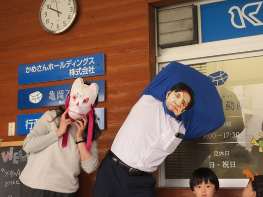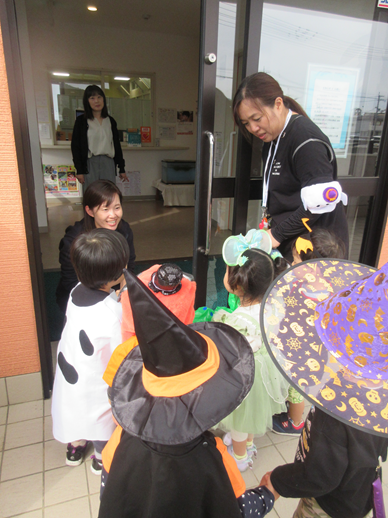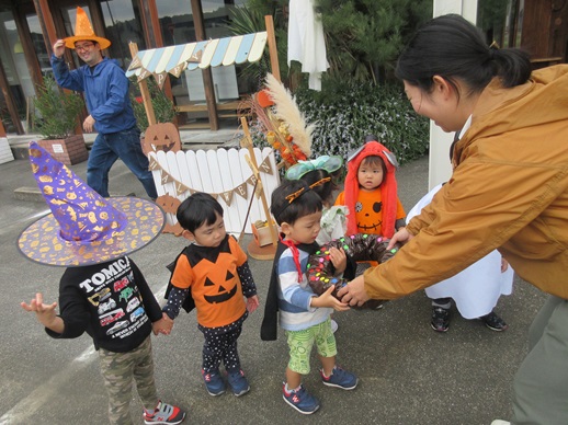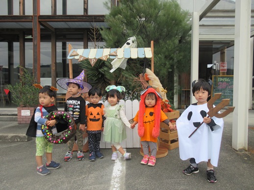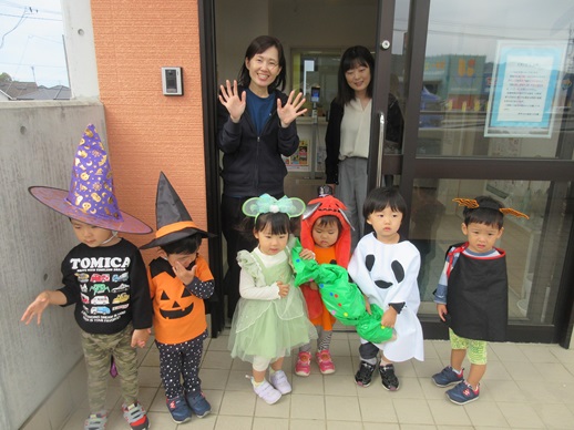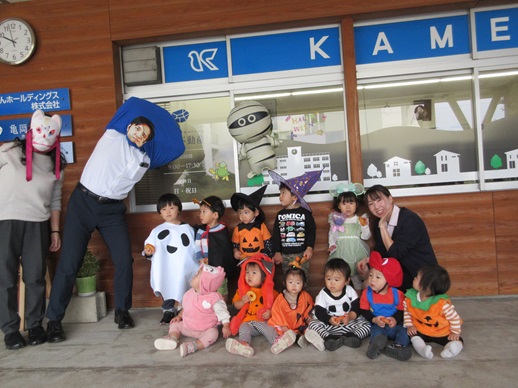 仮装をして、亀岡不動産さん、髙井設計事務所さん、嶝野家具さん、姉妹園の伊予くじら認定こども園を回りました。