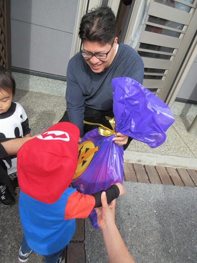 朝のおやつは、「トリックオアトリート!」と言って、園長先生から一人ひとり渡してもらいました。