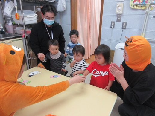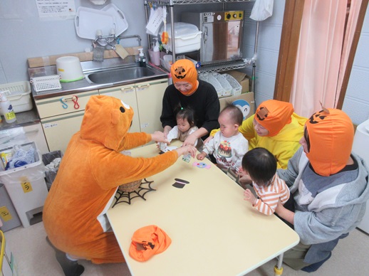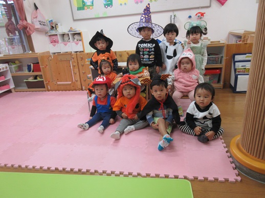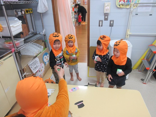 夕方、2歳児さんのおしゃべりをきいていると、「ハロウィンいいね!」「ハロウィン楽しいね!」と言う声が聞こえてきました。