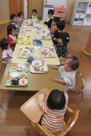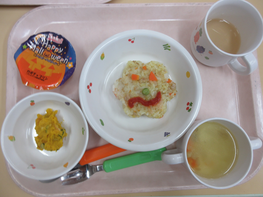 給食は、ハロウィンカレーピラフ かぼちゃのサラダ オニオンスープ ゼリーでした。子どもたちは給食をみて、「わぁ~ハロウィン!」と喜んでいました。給食の先生方、ありがとうございました!