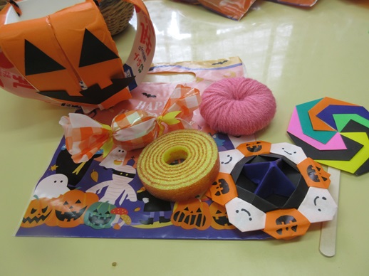 2歳児さんは、「トリックオアトリート!」と各場所で言えて、たくさんお菓子(製作物)を貰う事ができましたよ🍭🍩