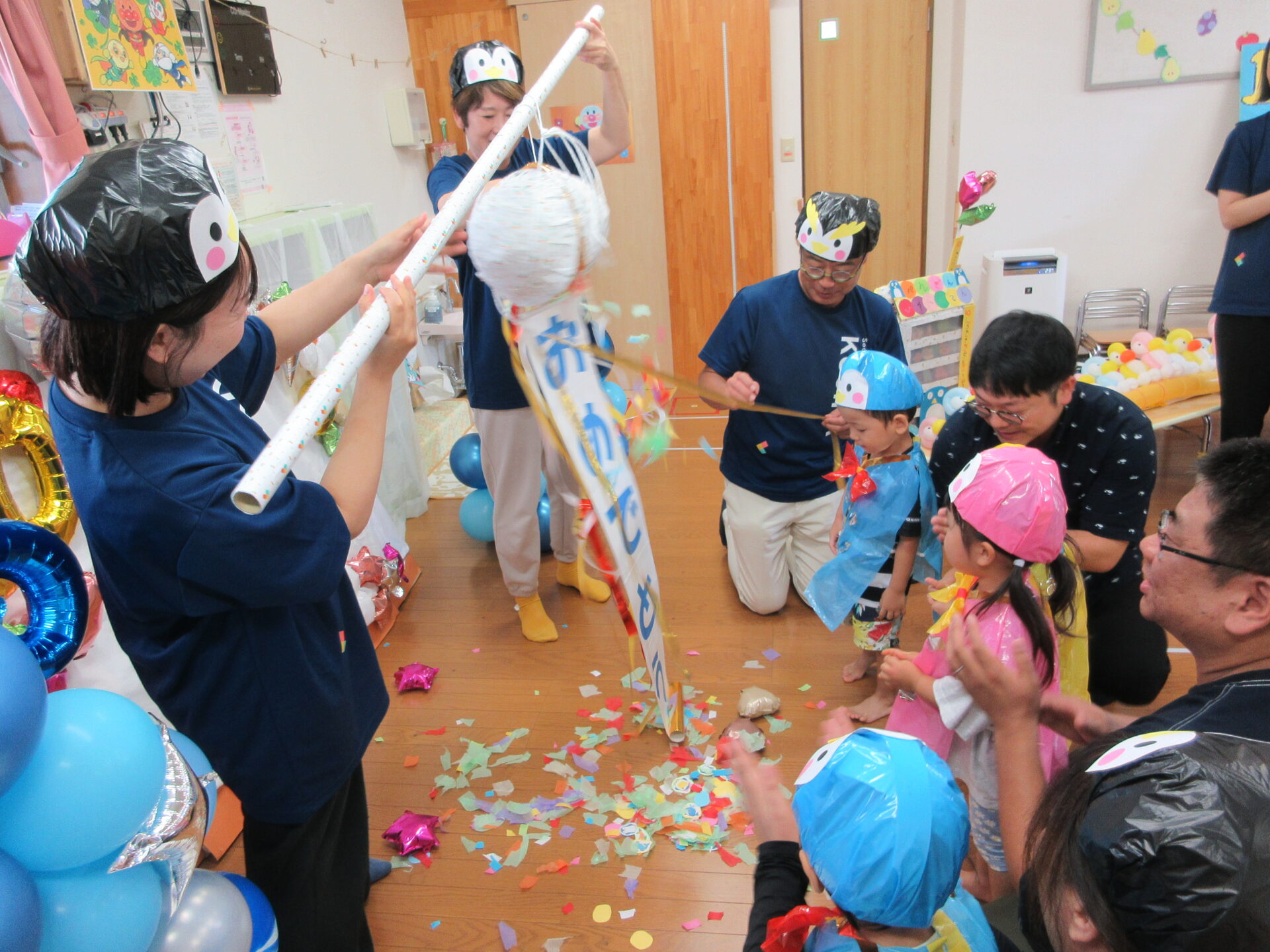 理事長先生や全園長先生にも参加していただき、紐を引っ張ってパカーン!!
