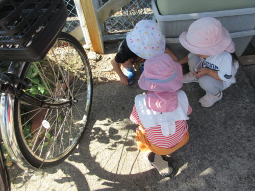 お散歩に出掛けるので、外に出るとぺんぎん組の子どもたち(2歳児)が何かを発見し、集まって見始めました。