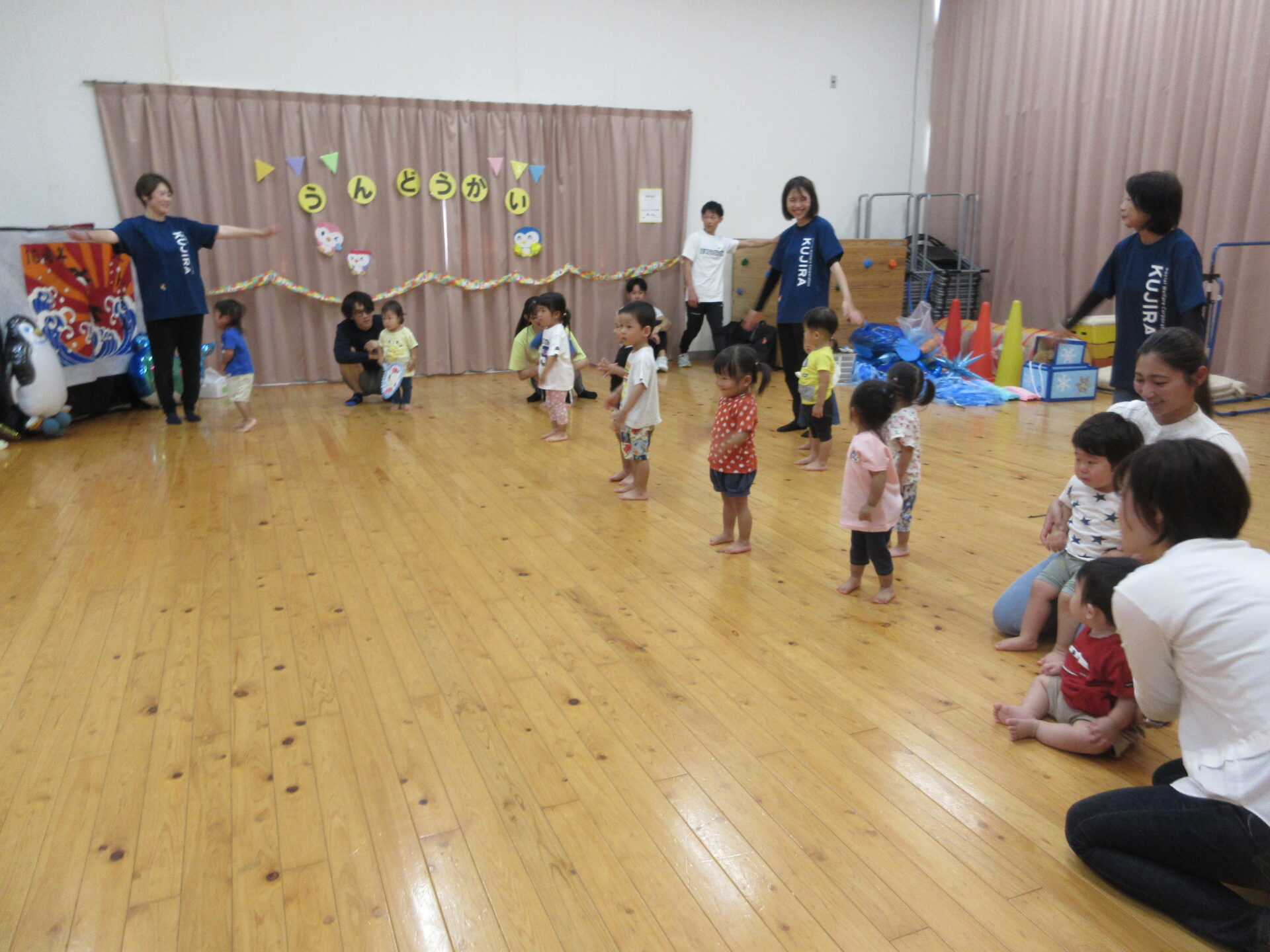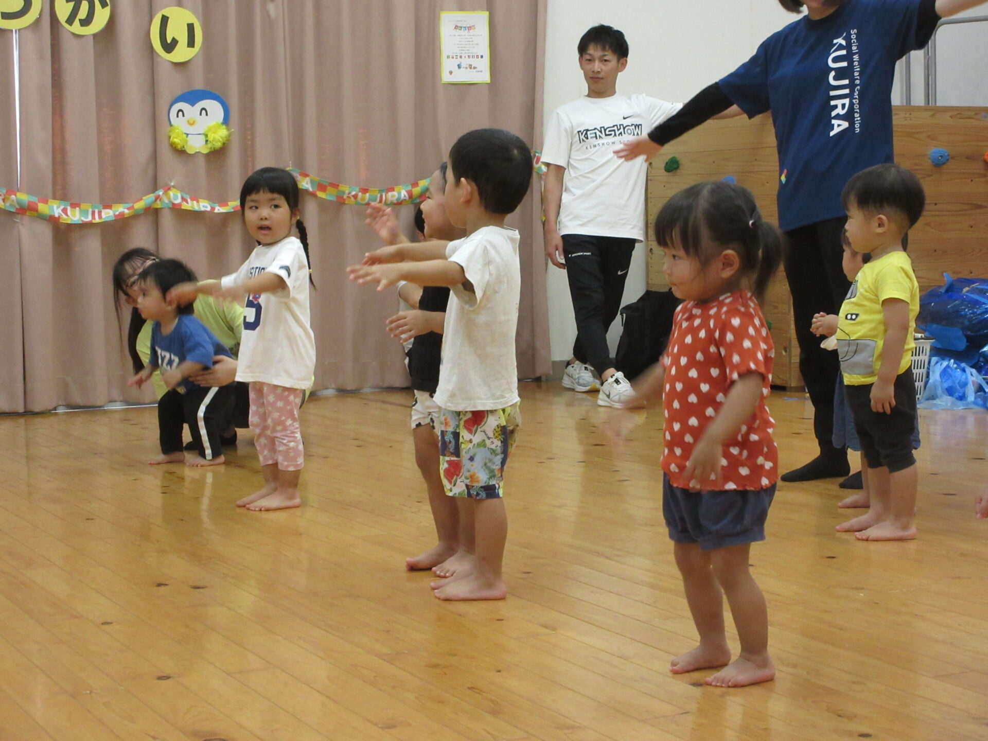 ぺんぎん組(2歳児)が毎月している、体操教室。けんしょう先生と一緒に頑張ります。