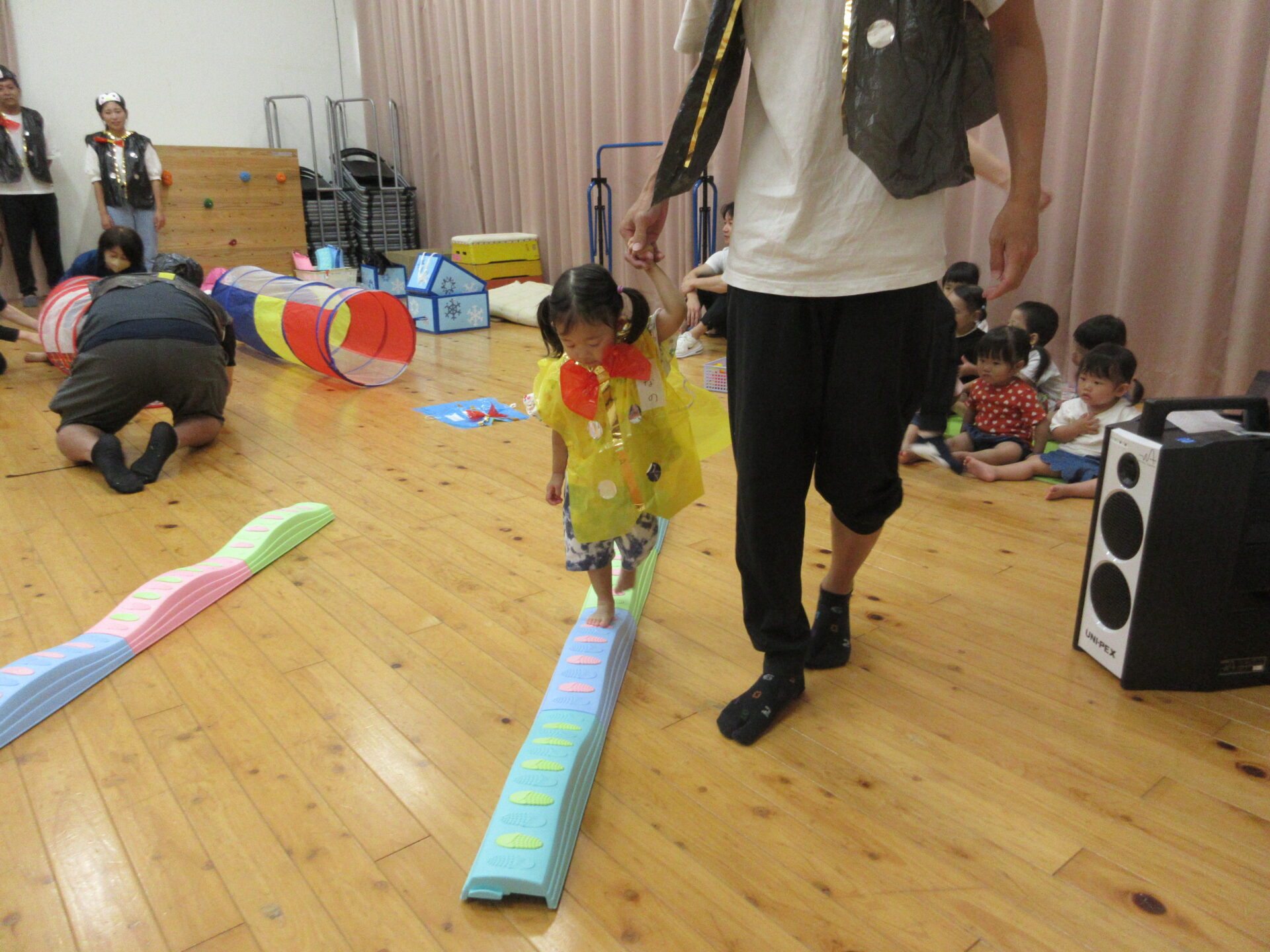最後は、お家の人とふれあい遊びをして、先生から「頑張ったね!」とメダルとお土産をもらいました。