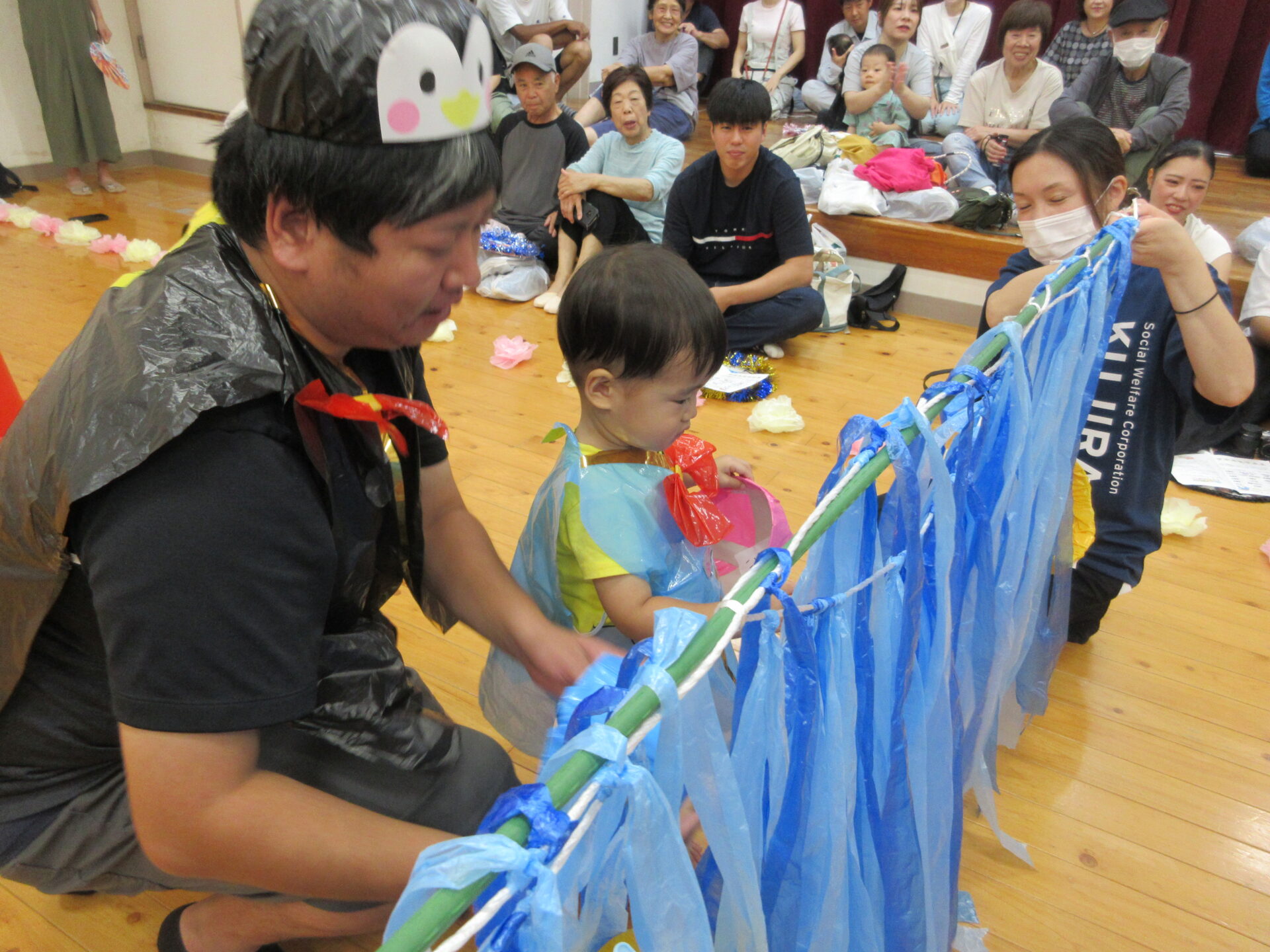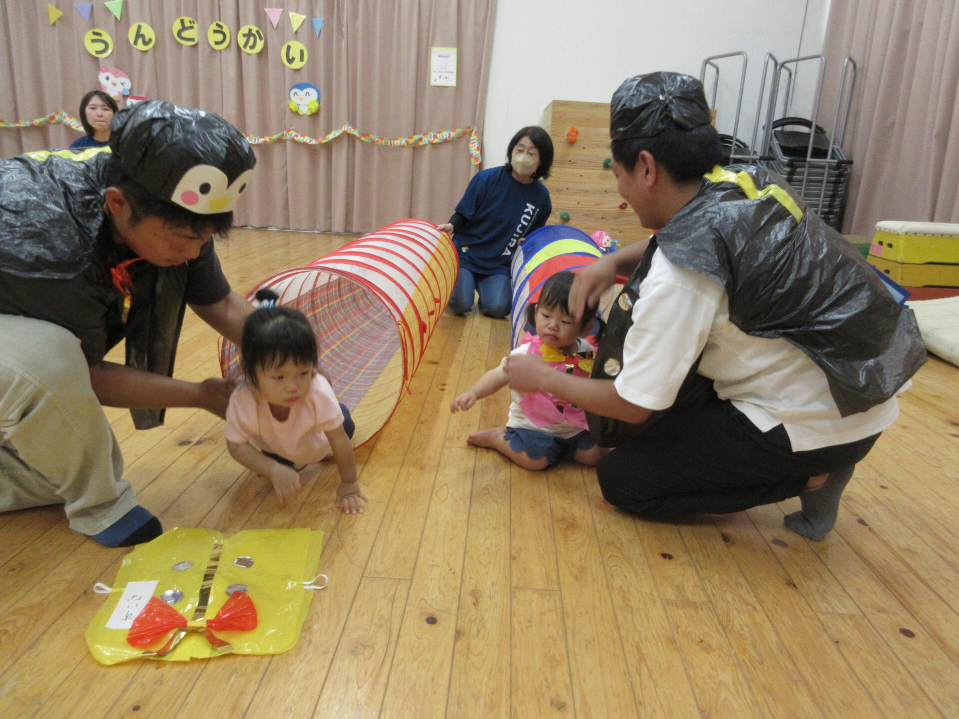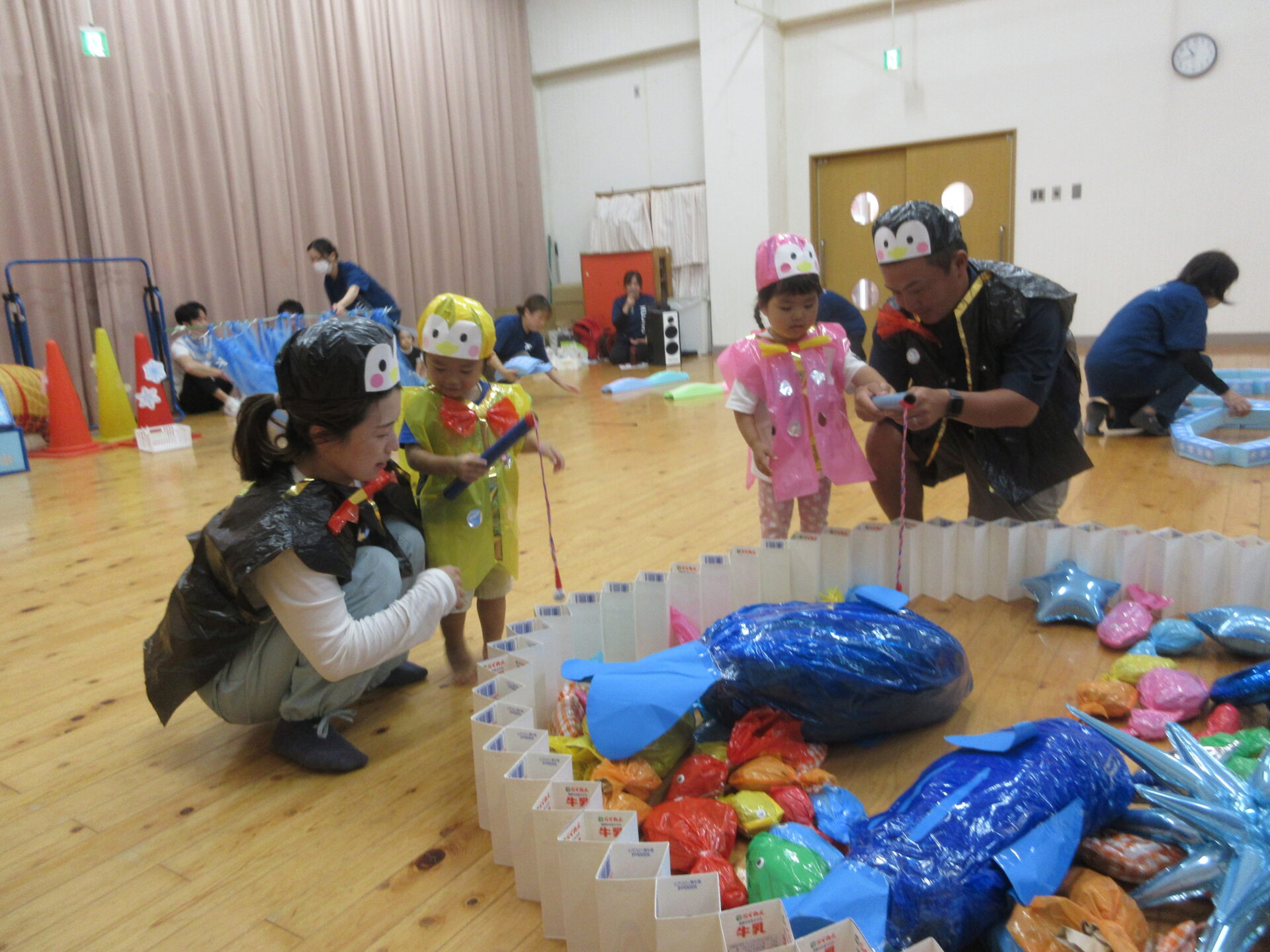 親子競技は、魚釣りをメインにかわいいぺんぎんの衣装を着けて楽しみました。