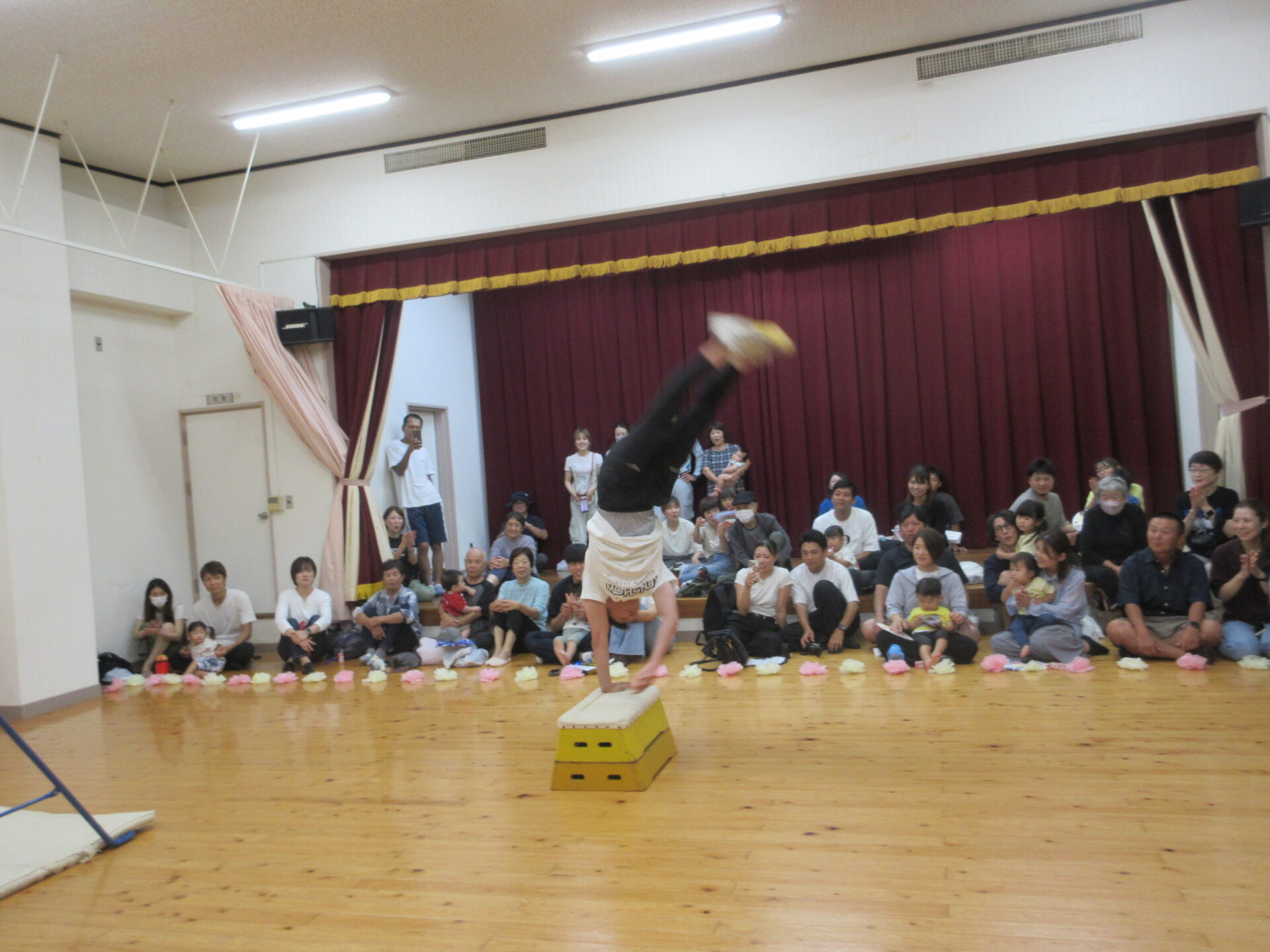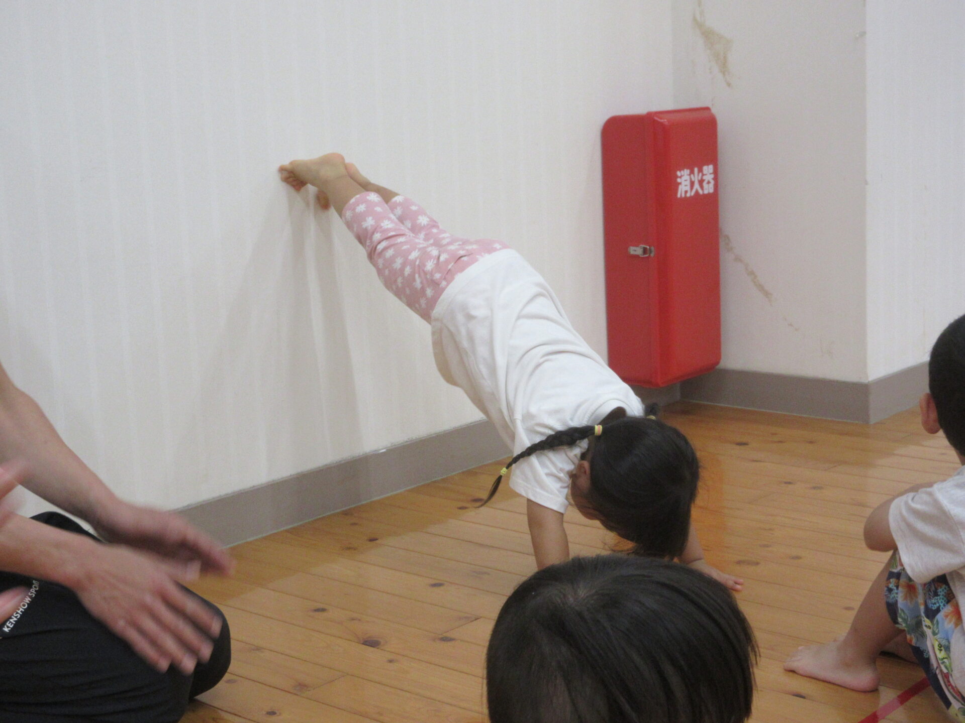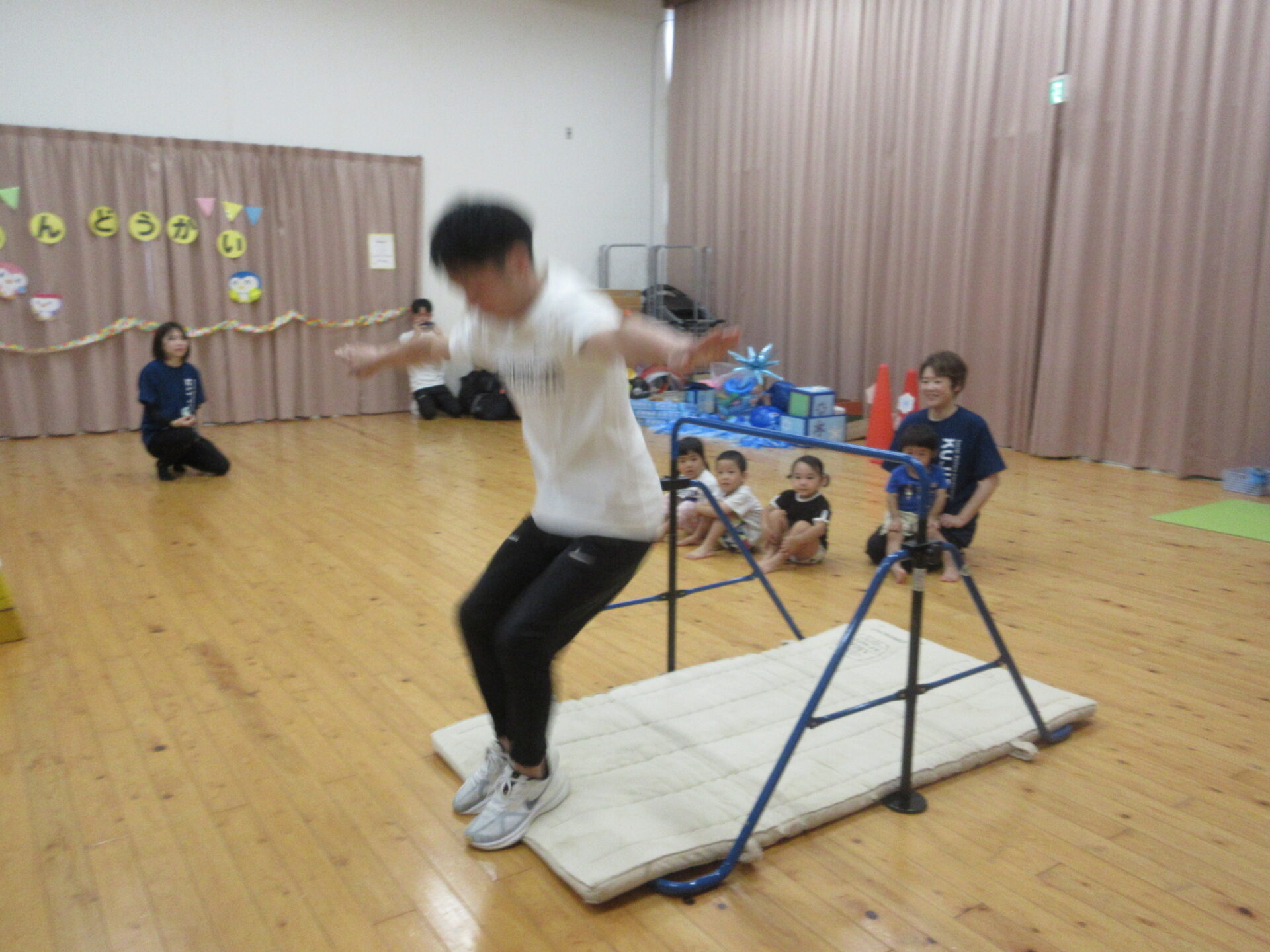壁倒立、マット、鉄棒、跳び箱を披露しました。毎年恒例のぺんぎん組の見せ場です。