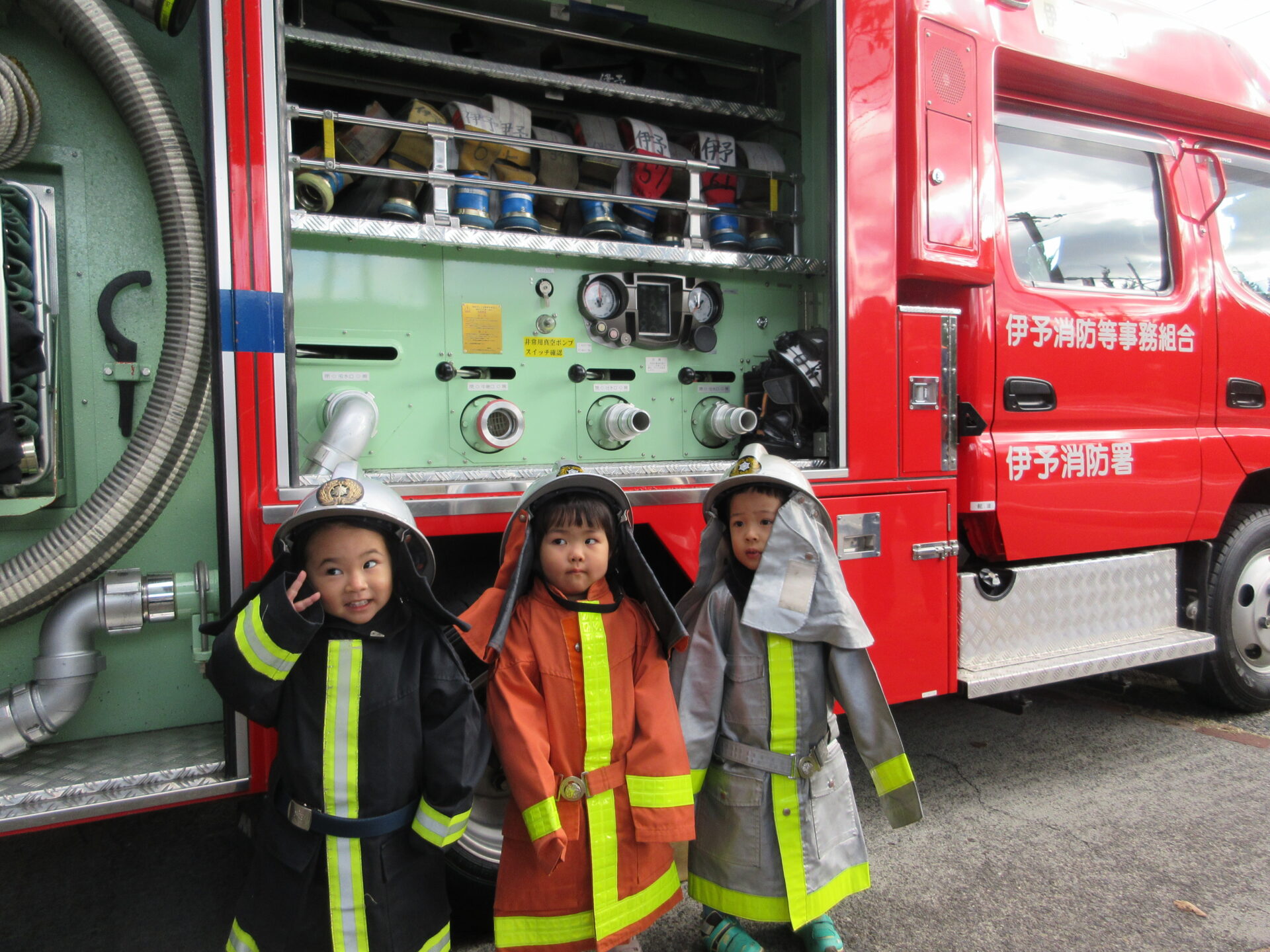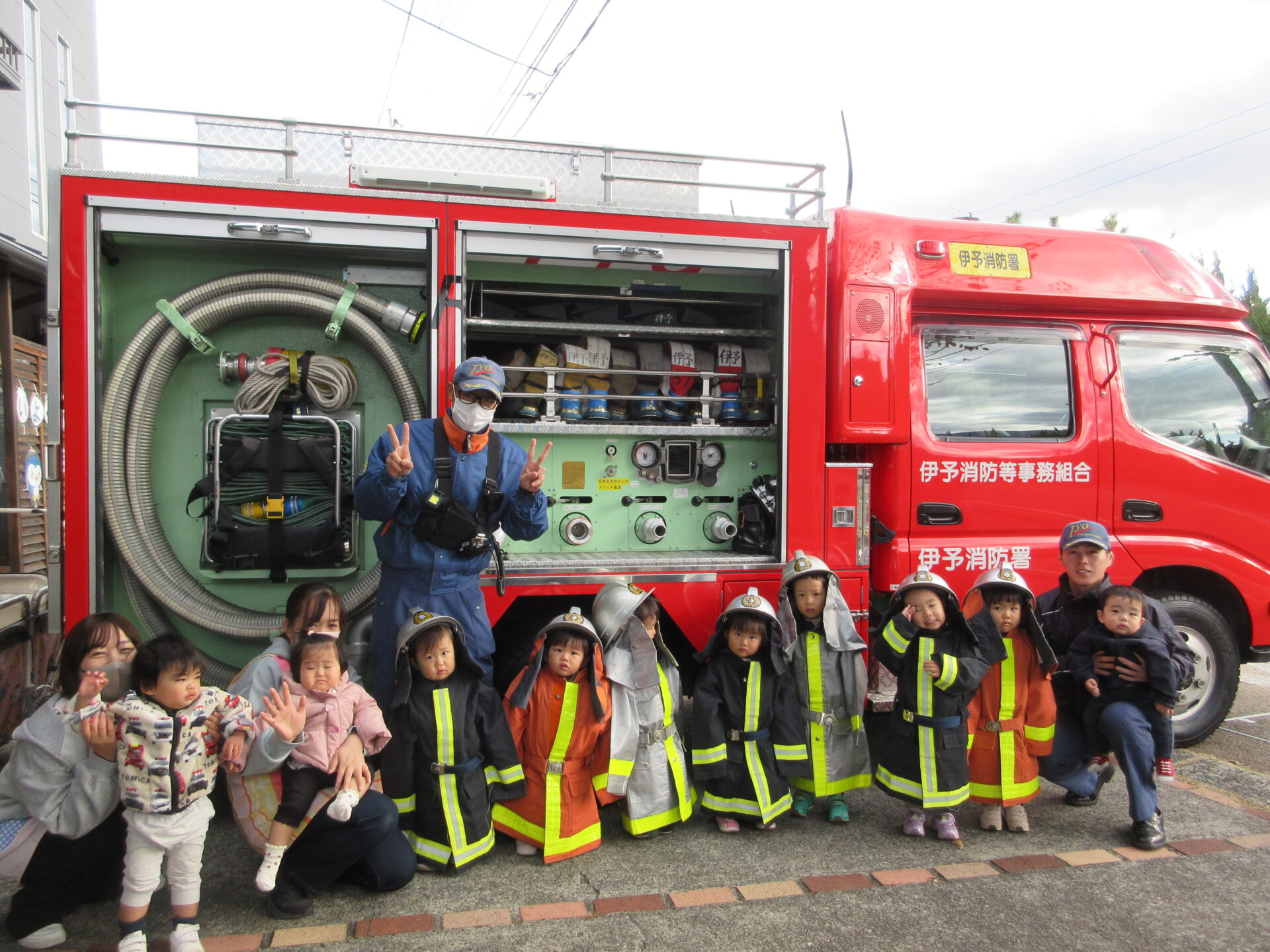 今月の避難訓練は、伊予消防署の消防士さんに来てもらい行いました。