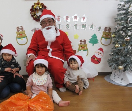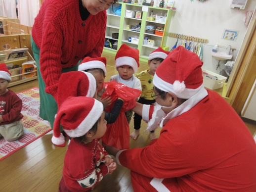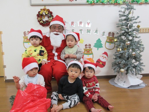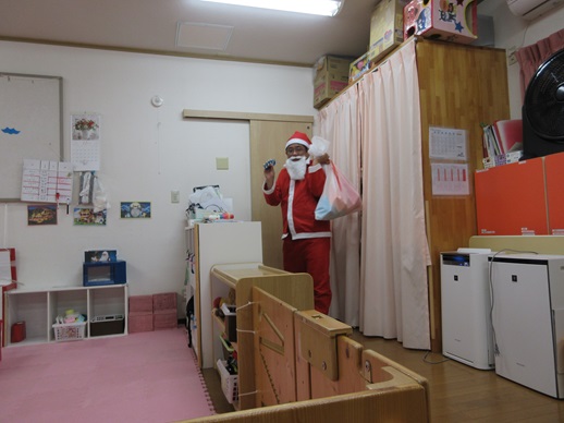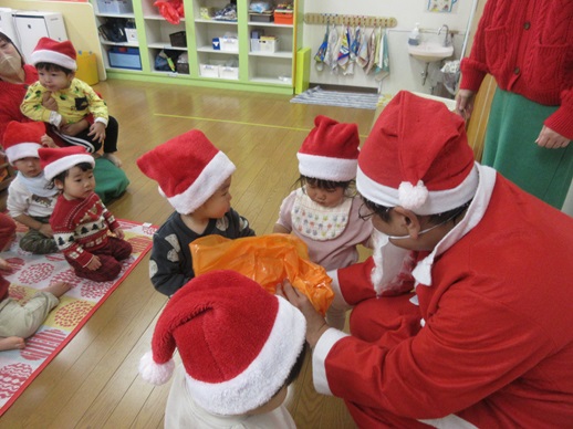 そして、みんなが楽しみにしていたサンタさんが登場!ぺんぎん保育園は、0,1,2歳児の保育園なので、「きゃー😍」とはならず、みんな目を丸くして「・・・」(笑)