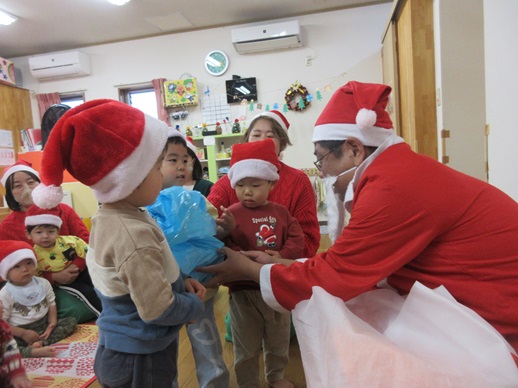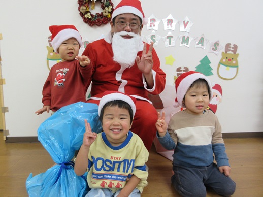 サンタさんからプレゼントを受け取り、嬉しそうな子どもたち😊