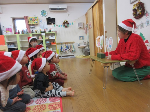 まずはマジックシアターやペープサートでクリスマスのお話を聞きました。