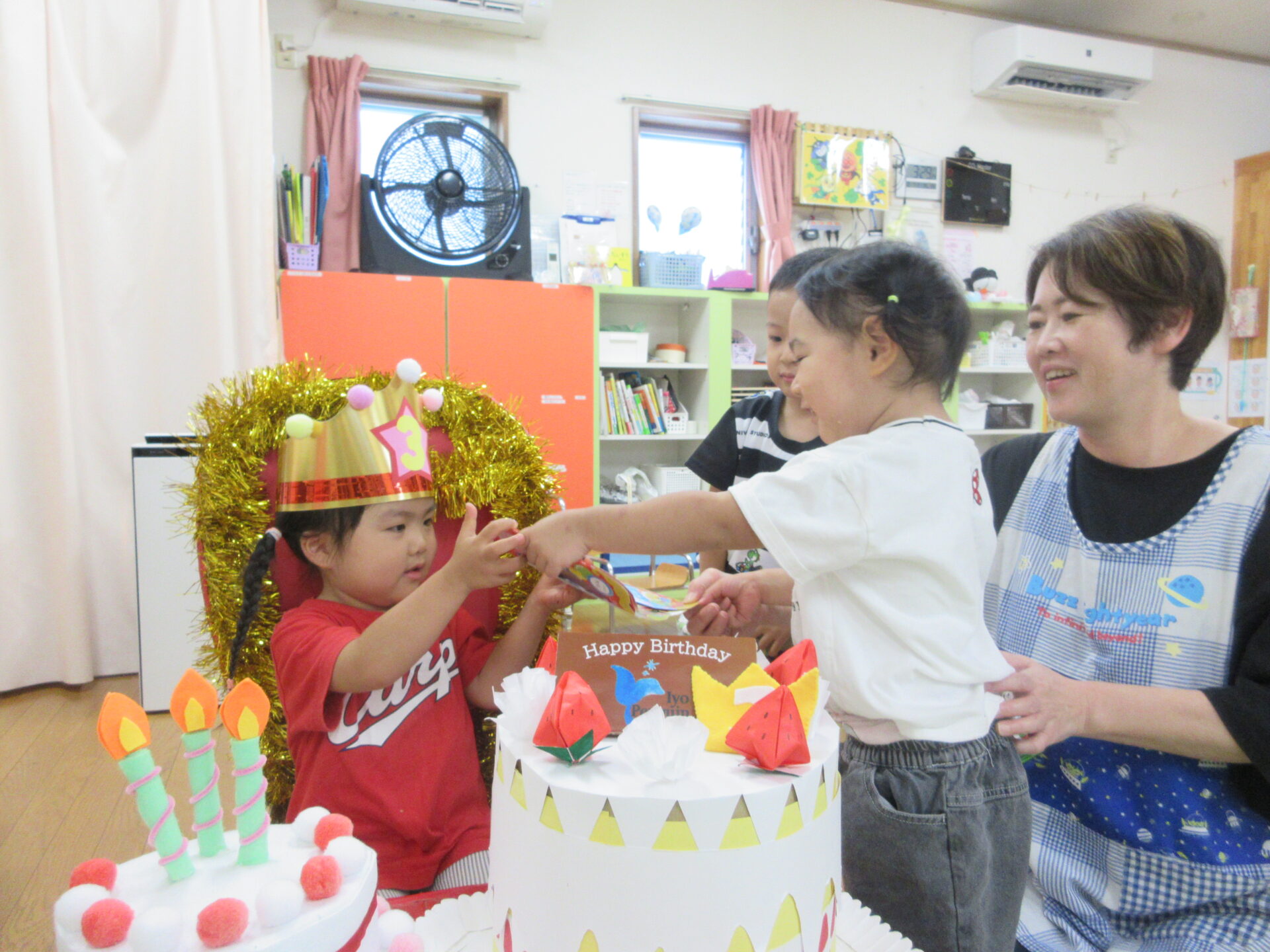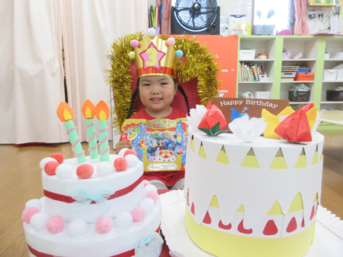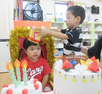 同じクラスのお友だちから、冠とバースデイカードのプレゼントを渡してもらって嬉しそうなAちゃん。