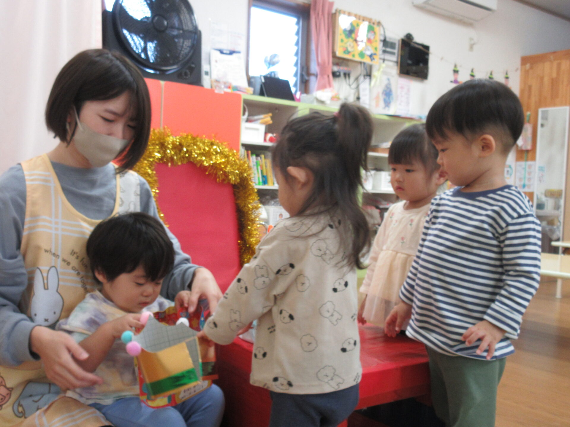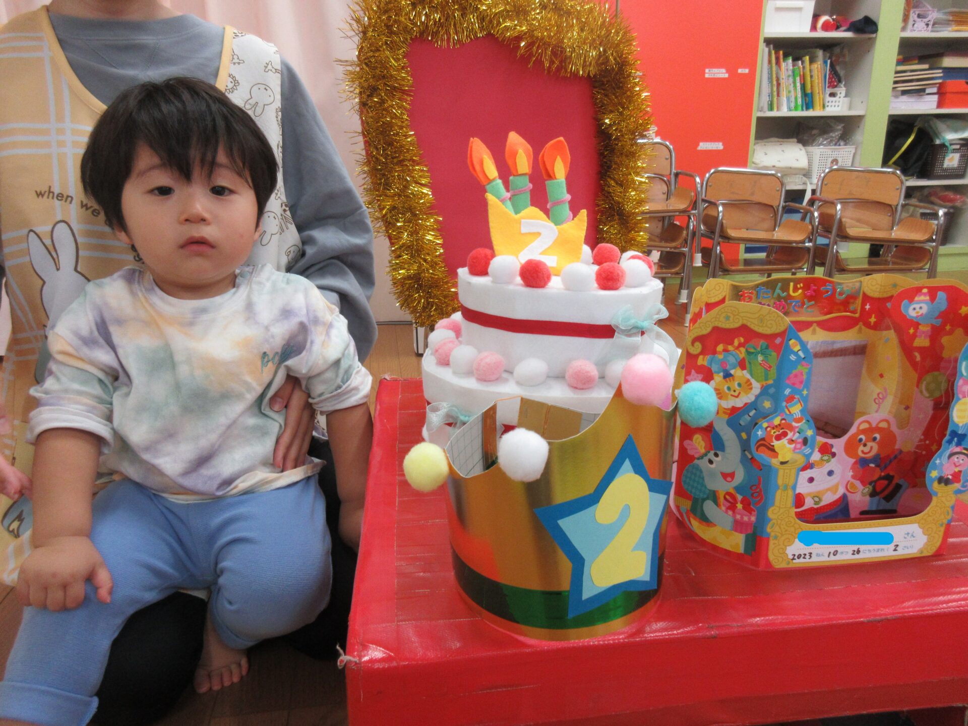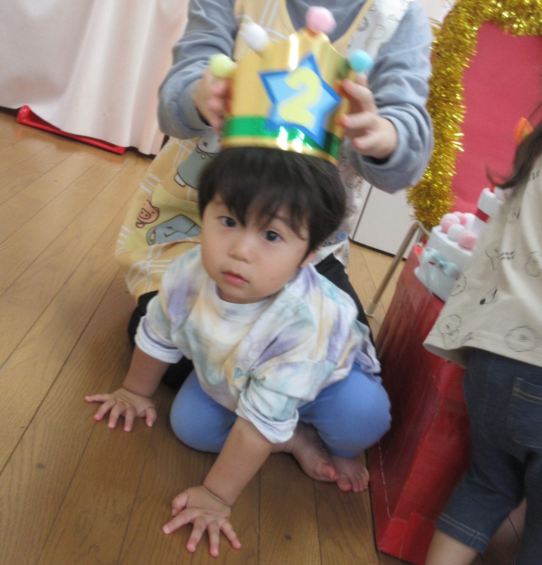 そら組(1歳児)のお友だちに王冠やカードを渡してもらって嬉しそうにしていましたよ!