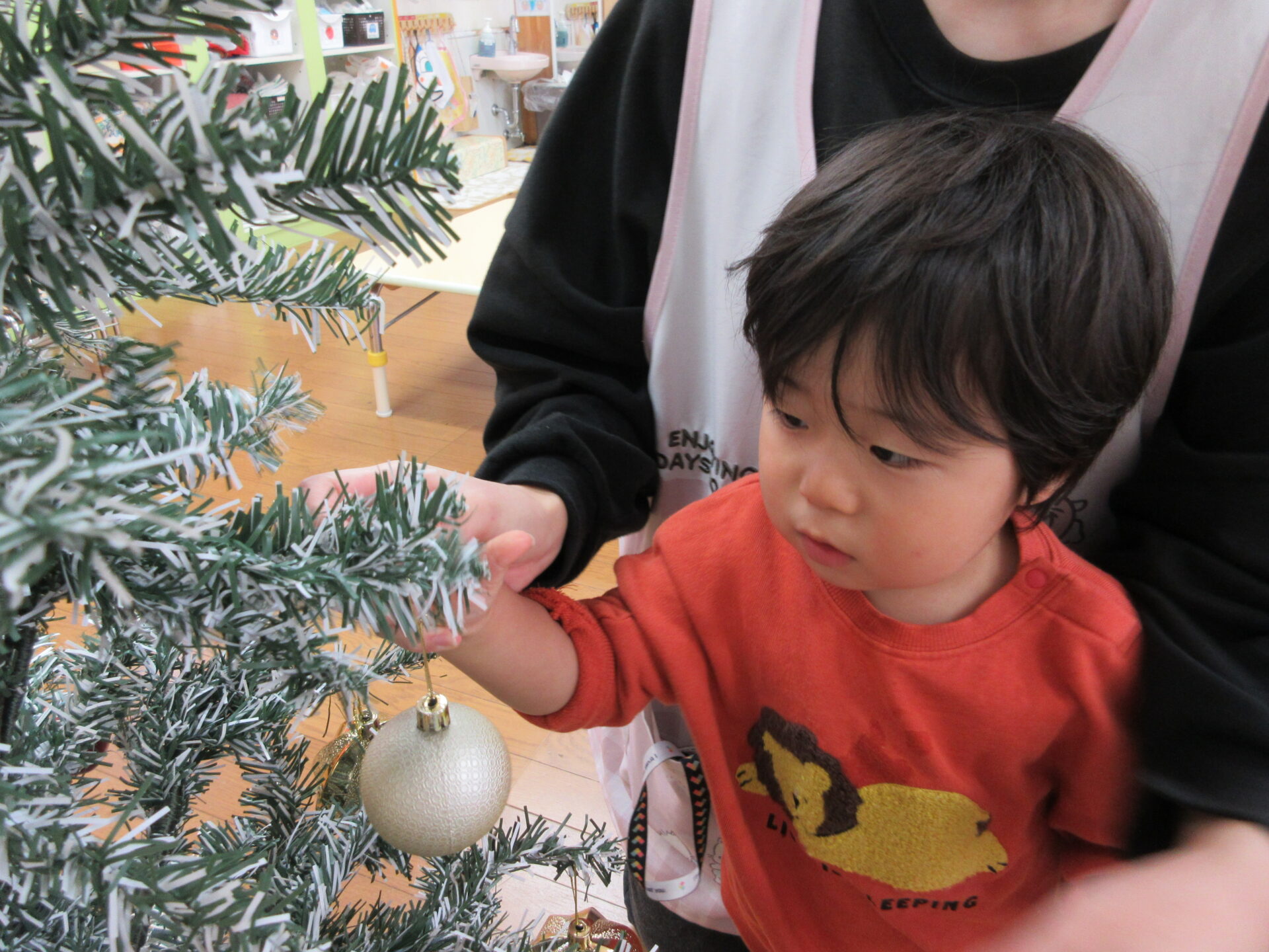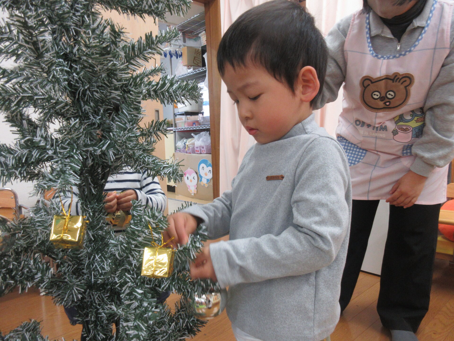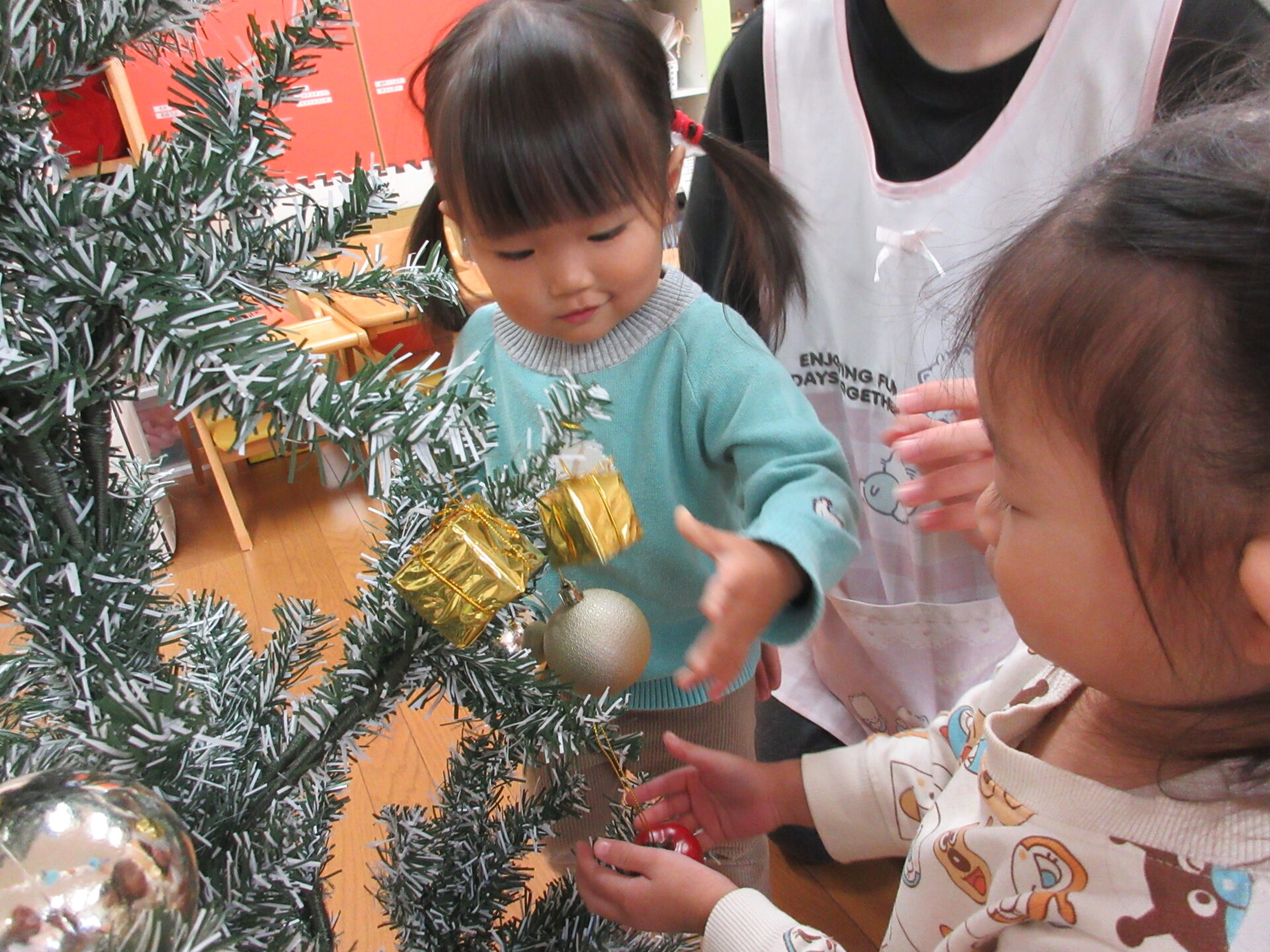 保育園ではクリスマスツリーをみんなで飾りつけしました。