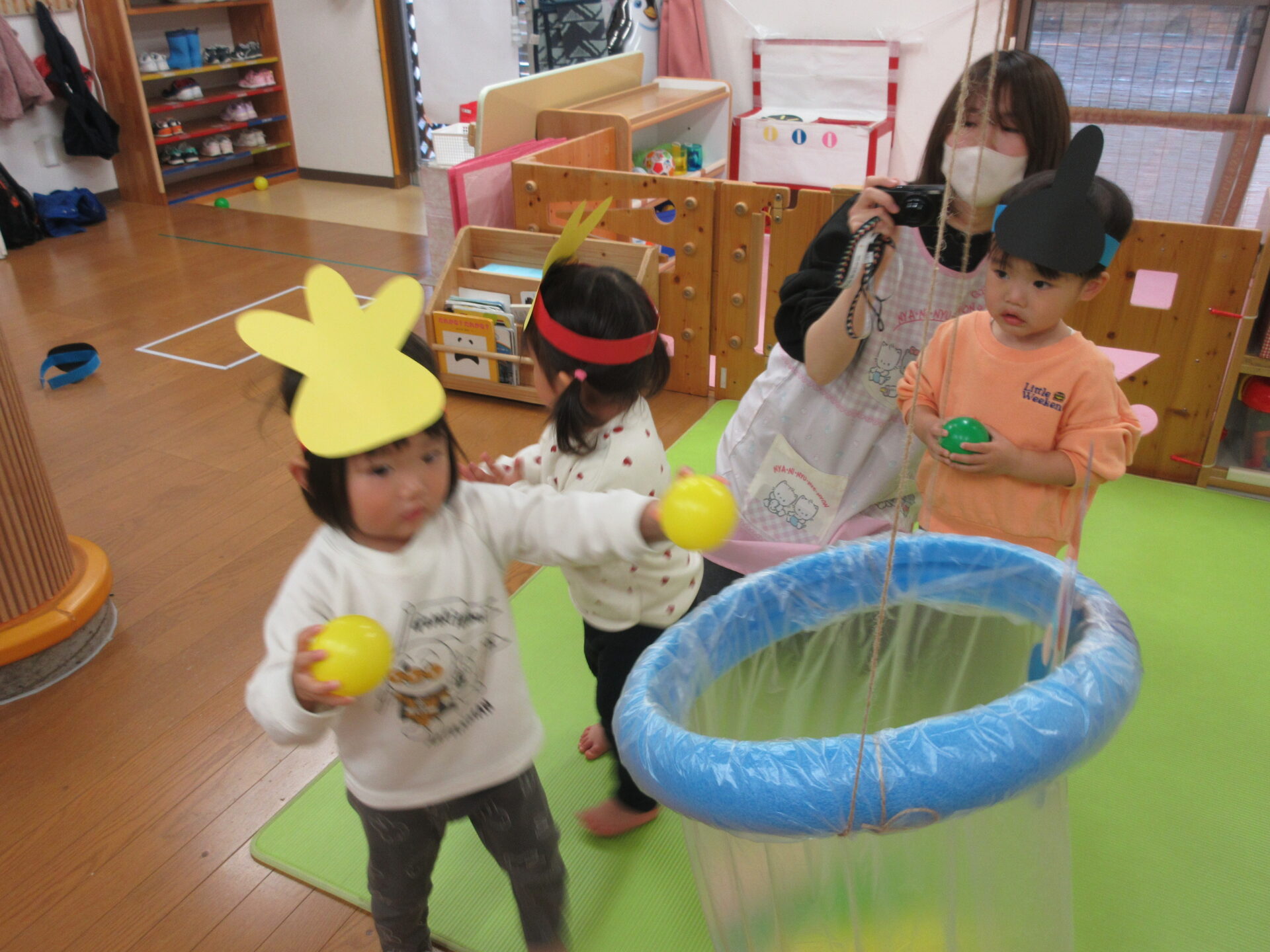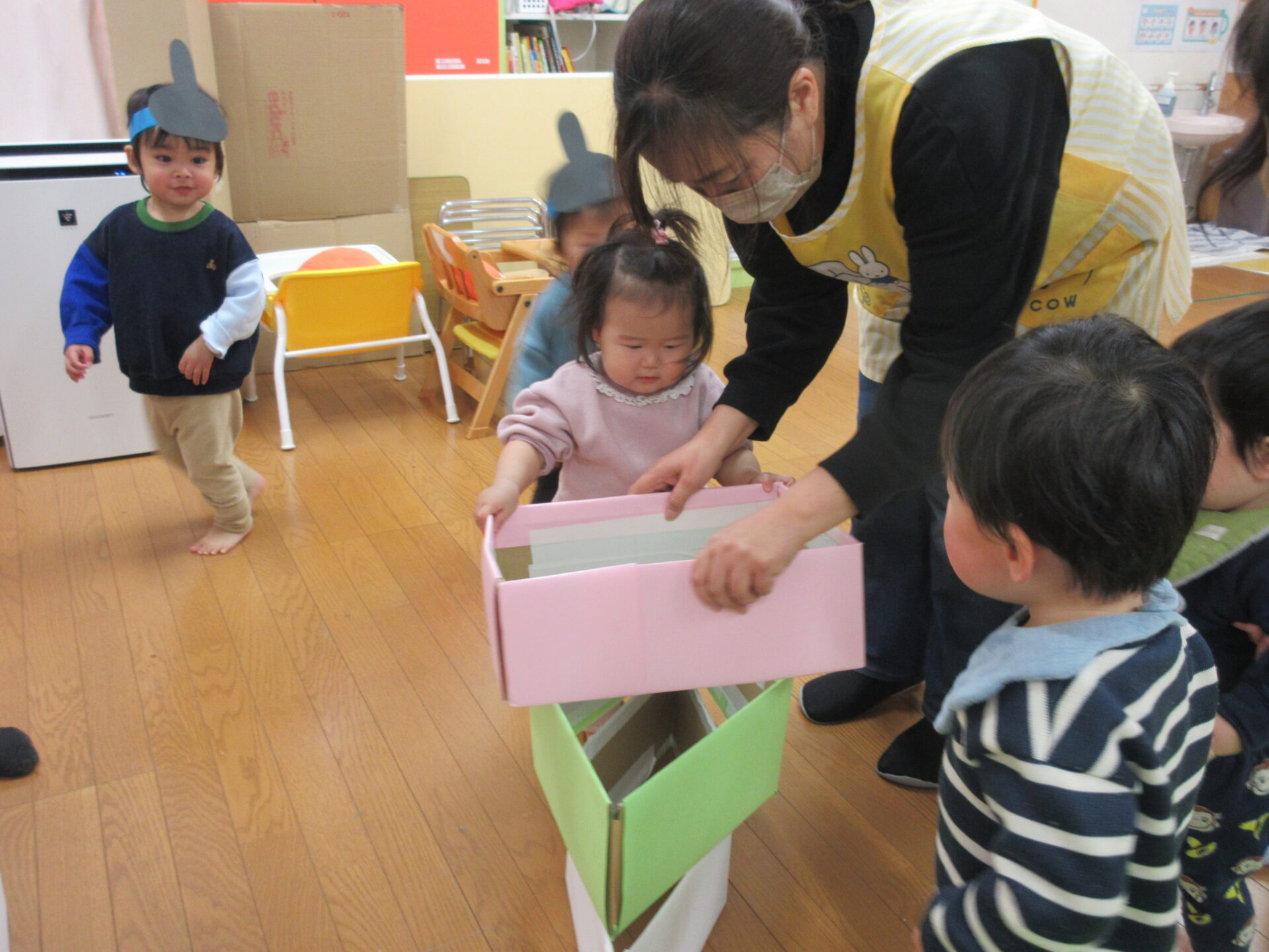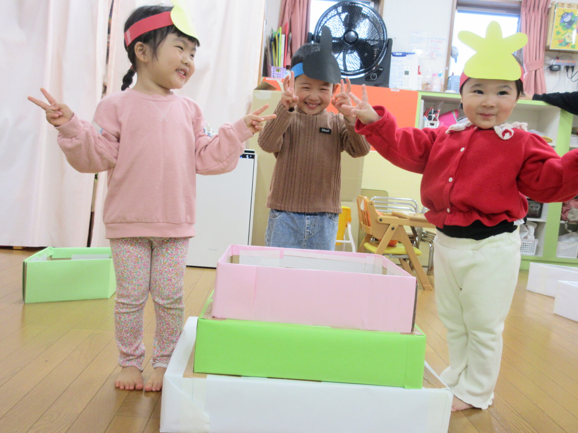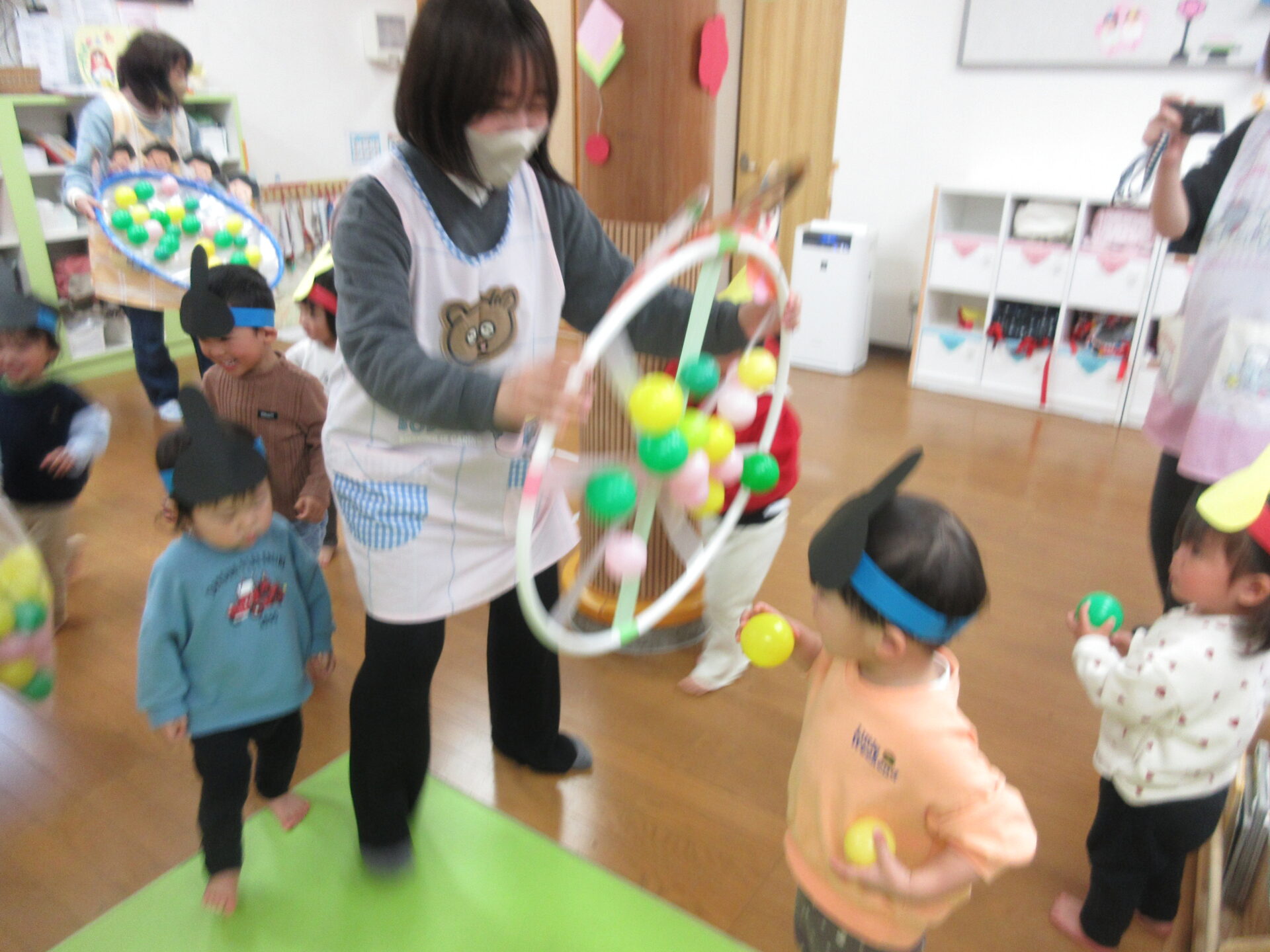 「大変!みんなで拾おう!」と、協力してひなあられを拾いました👏